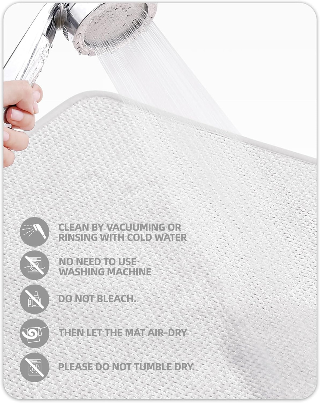 COLOR&GEOMETRY kupaonska prostirka iznimno se lako čisti. Za manje nečistoće, jednostavno je možete isprati glava tuša ili spužvom. Za veće nečistoće preporučuje se korištenje četke ili spužve za temeljitije čišćenje. Kupaonska prostirka je periva, stoga se preporučuje redovito pranje radi održavanja higijene. Zbog tankog dizajna, lako se suši, tako da na njoj ne ostaje vlaga koja bi mogla dovesti do plijesni.