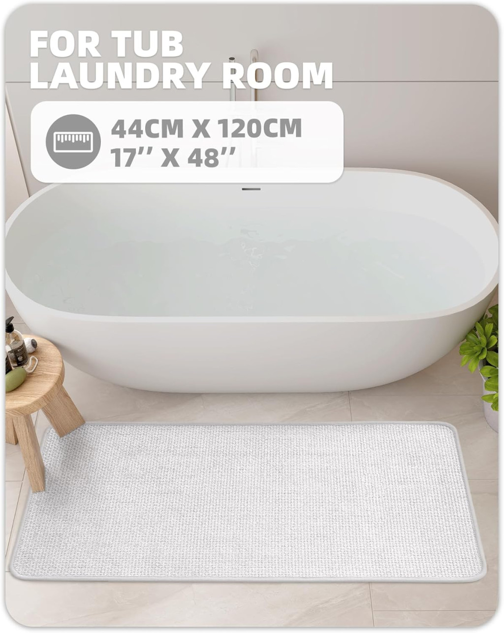 Veličina 44 x 120 cm idealan je izbor za većinu kupaonica. Ovaj izduženi oblik savršeno se uklapa ispred tuš kabine, pored kade ili ispred umivaonika. Tanki profil, debljine 2,54 cm, ne ometa otvaranje vrata i lako se pohranjuje kada se ne koristi. Proizvod je težak 1,16 kg, što ga čini laganim za pomicanje i pranje.