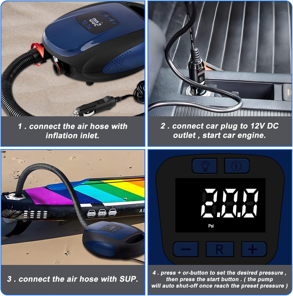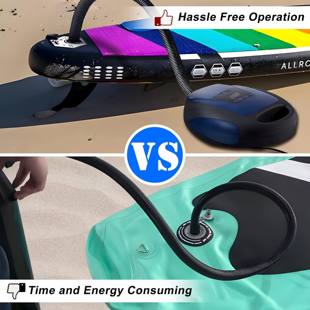 Ruitx 20PSI električna SUP pumpa revolucionarizira pripreme za sportove na vodi! Ovaj kompaktan, ali snažan uređaj u trenu napuhuje vašu SUP dasku, kajak ili druge napuhane uređaje. S inteligentnim digitalnim zaslonom i funkcijom automatskog isključivanja, ova pumpa je savršen pratitelj za svaku avanturu na vodi. Zahvaljujući 12V auto priključku, možete je koristiti bilo gdje gdje vam je automobil dostupan - bilo da se radi o obali jezera, rijeci ili moru.