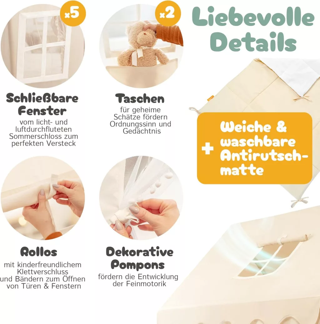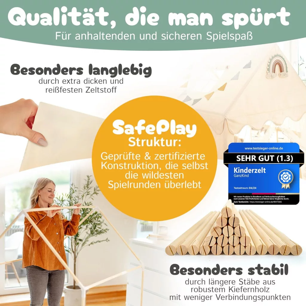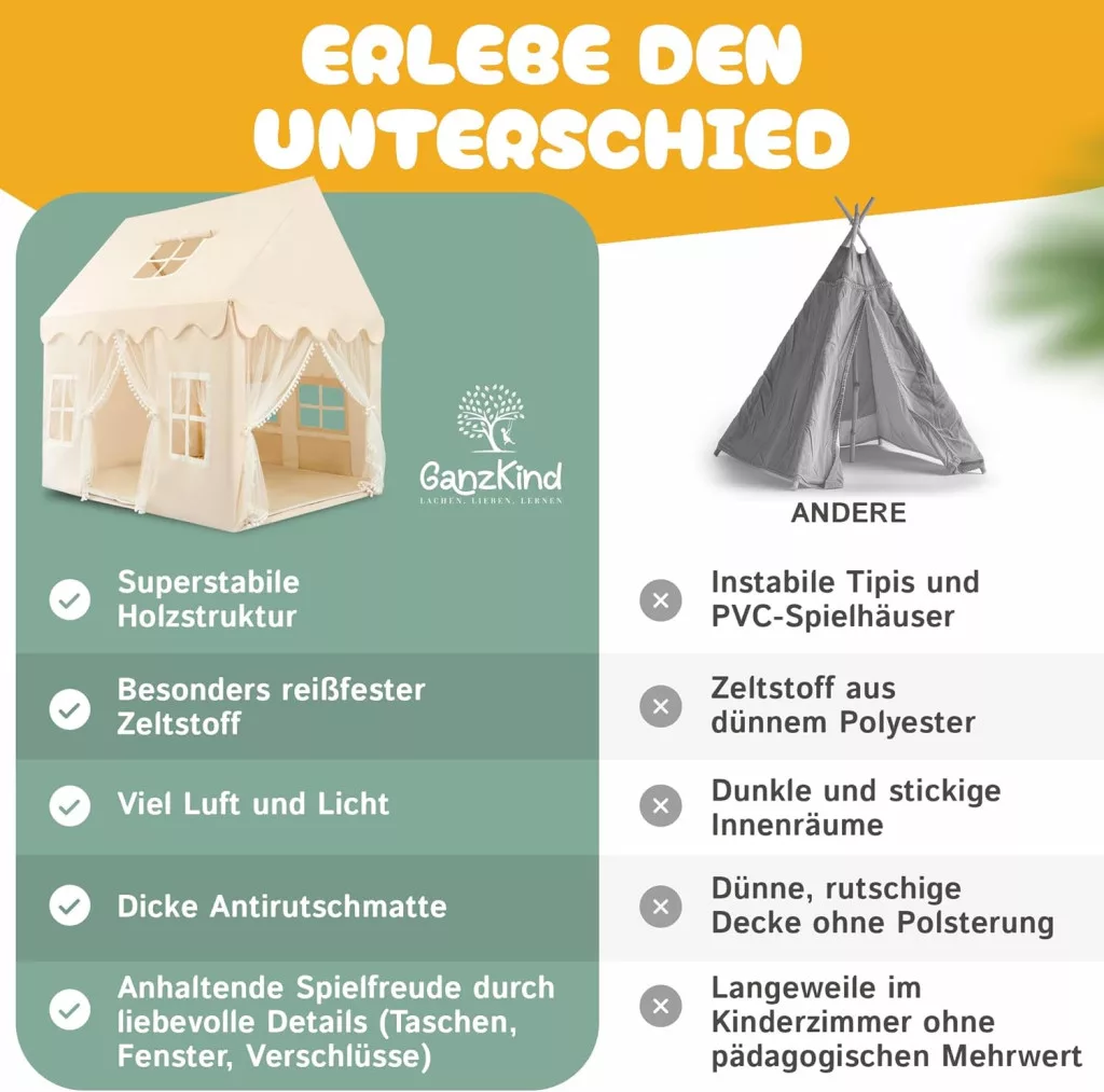 A szülők és nagyszülők megbíznak a GanzKindben, mert tudják, hogy egy olyan játékhelyet kapnak, amely nem csupán szórakoztató, hanem fejlesztő is. Az ablakoknak és bejáratoknak köszönhetően a sátor rugalmasan használható, és hosszú éveken át kíséri a gyermek játékos kalandjait.