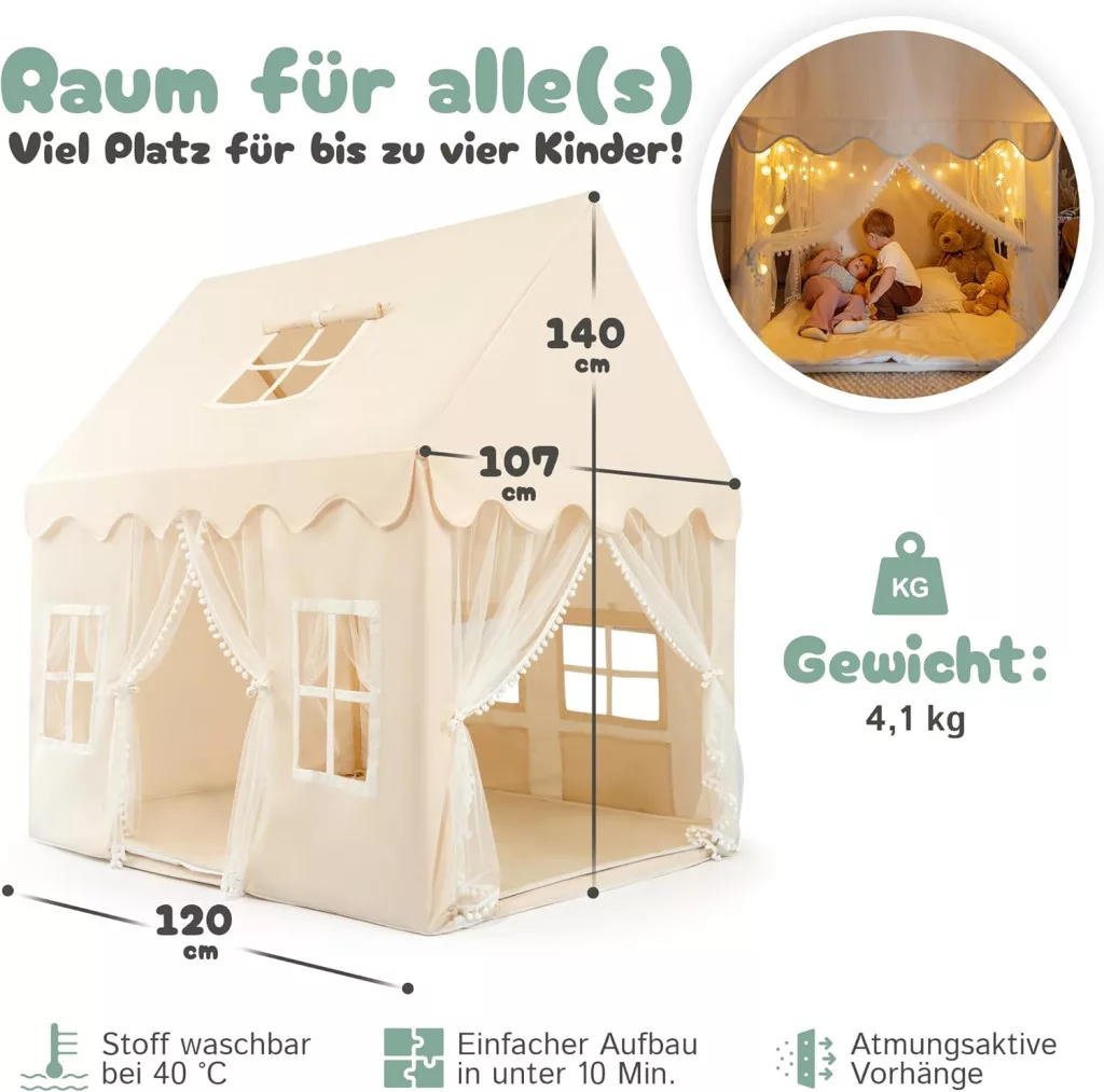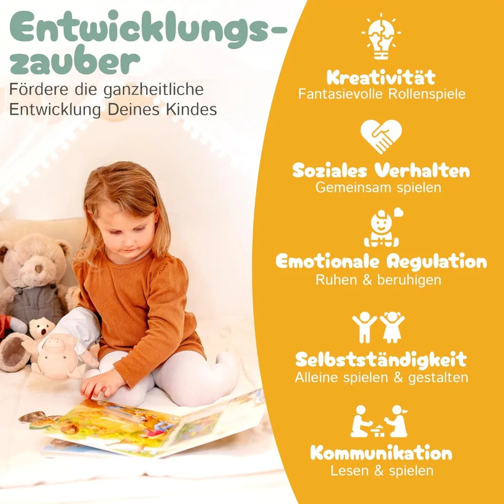 A GanzKind nem csupán egy játékszer – ez egy befektetés a gyermek fejlődésébe. A sátor támogatja a kognitív, szociális és érzelmi fejlődést interaktív és képzeletbeli játékon keresztül. A gondosan kiválasztott anyagok és a német minőségellenőrzés garantálja, hogy a gyermek biztonságban játszhat.
