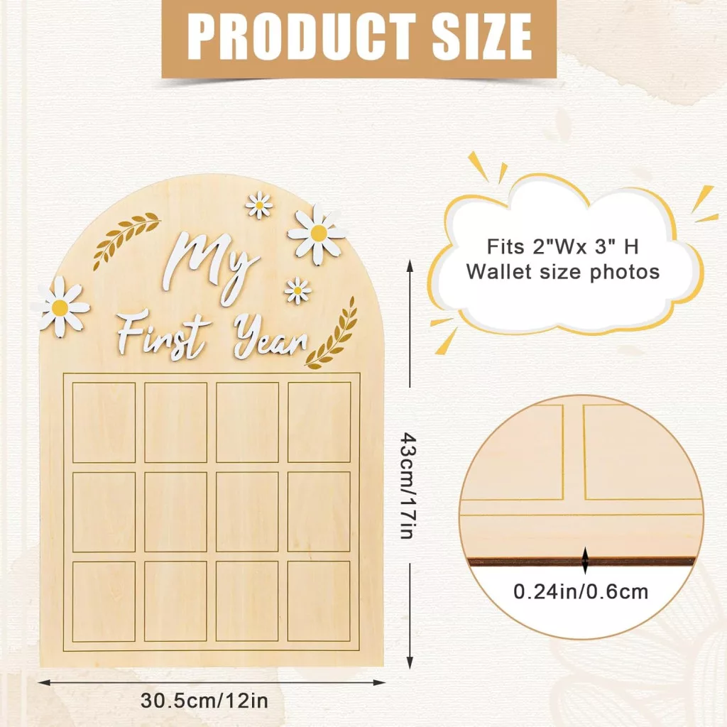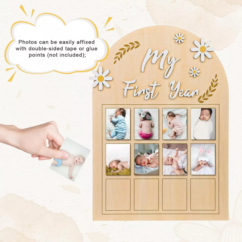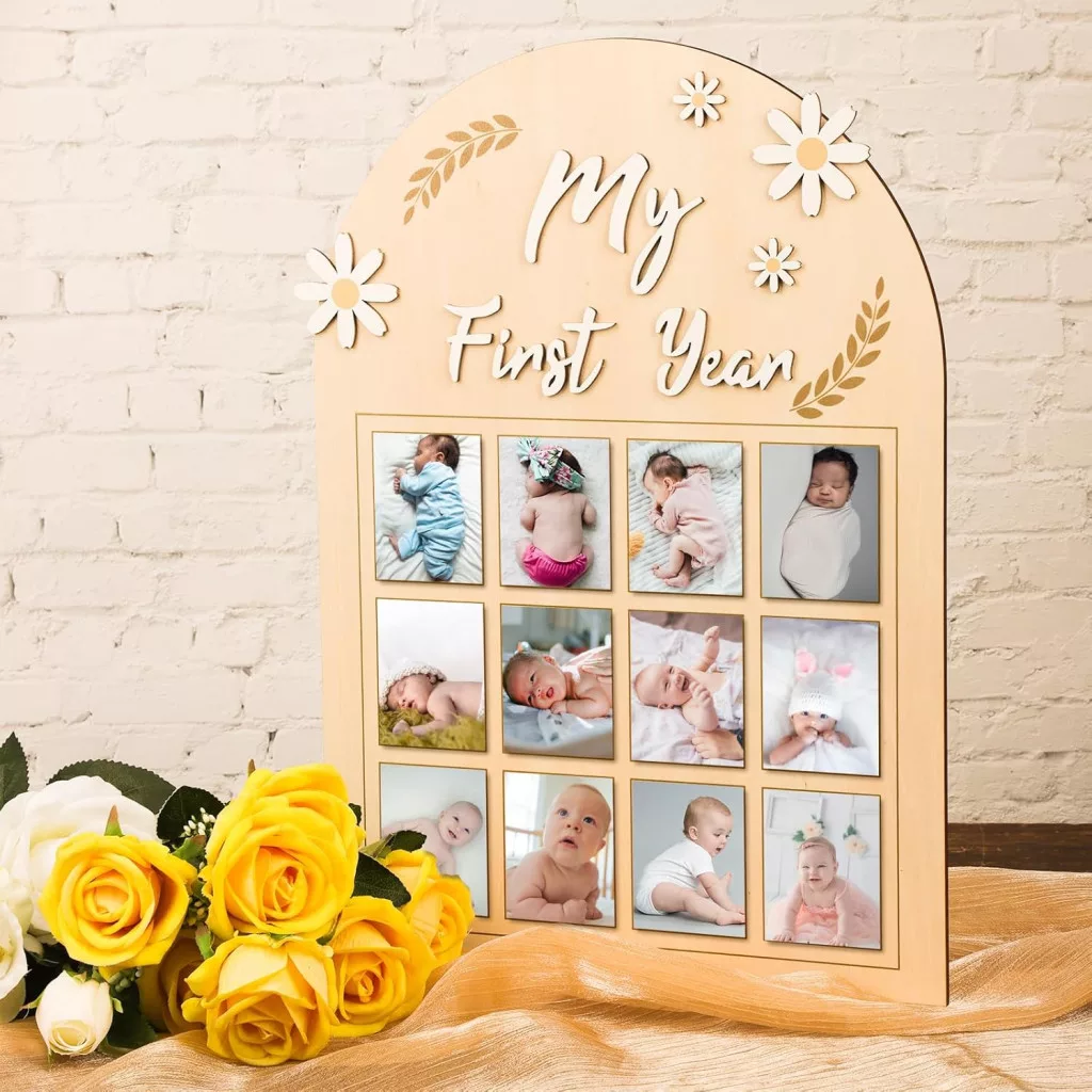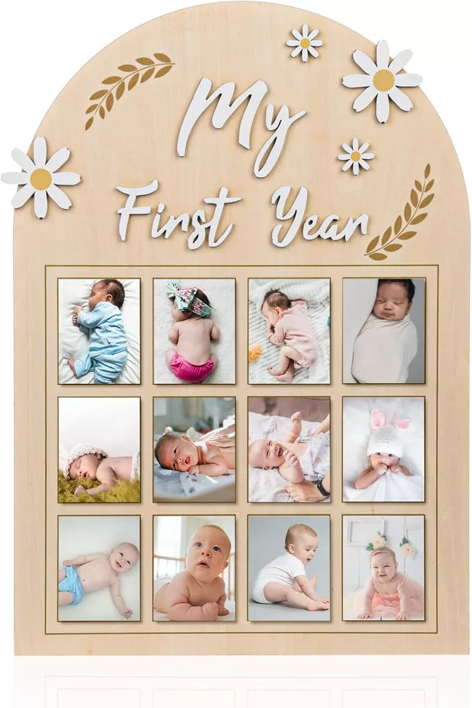 NQEUEPN Baba Első Év Fotókeret - 3D Margaréta Virágos Képtartó 12 Hónapos Fotósorozathoz - Fa Emléktábla Újszülött Emlékekhez - Első Születé