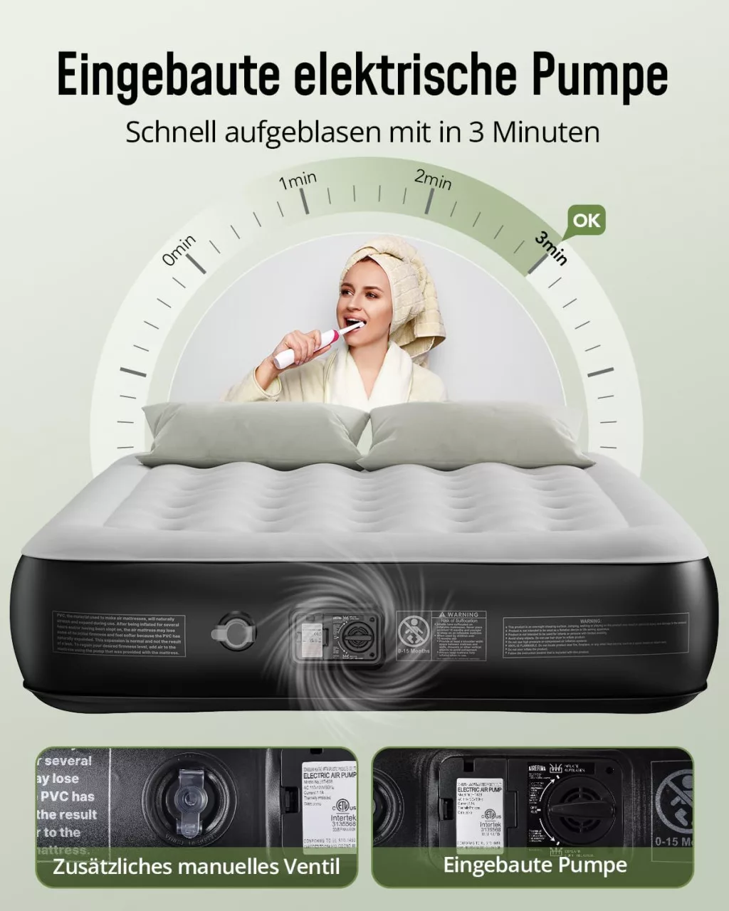 • ⏱️ Munjevito brzo napuhavanje: Ugrađena električna pumpa potpuno napuhuje madrac u samo 3 minute - nema više gubljenja vremena s tradicionalnim metodama napuhavanja.