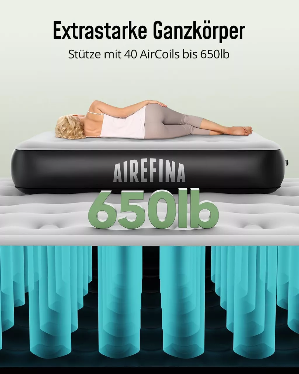 Airefina madrac na napuhavanje ističe se u usporedbi s drugim sličnim proizvodima brzim vremenom napuhavanja i visokokvalitetnim materijalima. Dok mnogim konkurentskim proizvodima treba 5-10 minuta za potpuno napuhavanje, Airefina je spreman za upotrebu u samo 3 minute. Dizajn s 40 unutarnjih zračnih komora također je prednost u odnosu na tradicionalne madrace na napuhavanje, koji često imaju samo 20-30 zračnih komora.