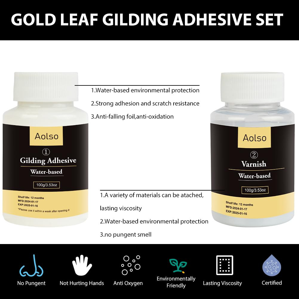 Az Aolso Arany Levél Ragasztó Szett egy kiváló választás mindazok számára, akik professzionális minőségű arany levél dekorációkat szeretnének létrehozni. A vízalapú formuláció biztonságos és környezetbarát, míg a teljes szett minden szükséges komponenst tartalmaz. Az egyszerű alkalmazási folyamat és a gyors száradási idő lehetővé teszi, hogy gyorsan és hatékonyan dolgozzon. Legyen szó hobbikézműves projektekről vagy professzionális munkákról, ez a szett megbízható és eredményes megoldást nyújt.