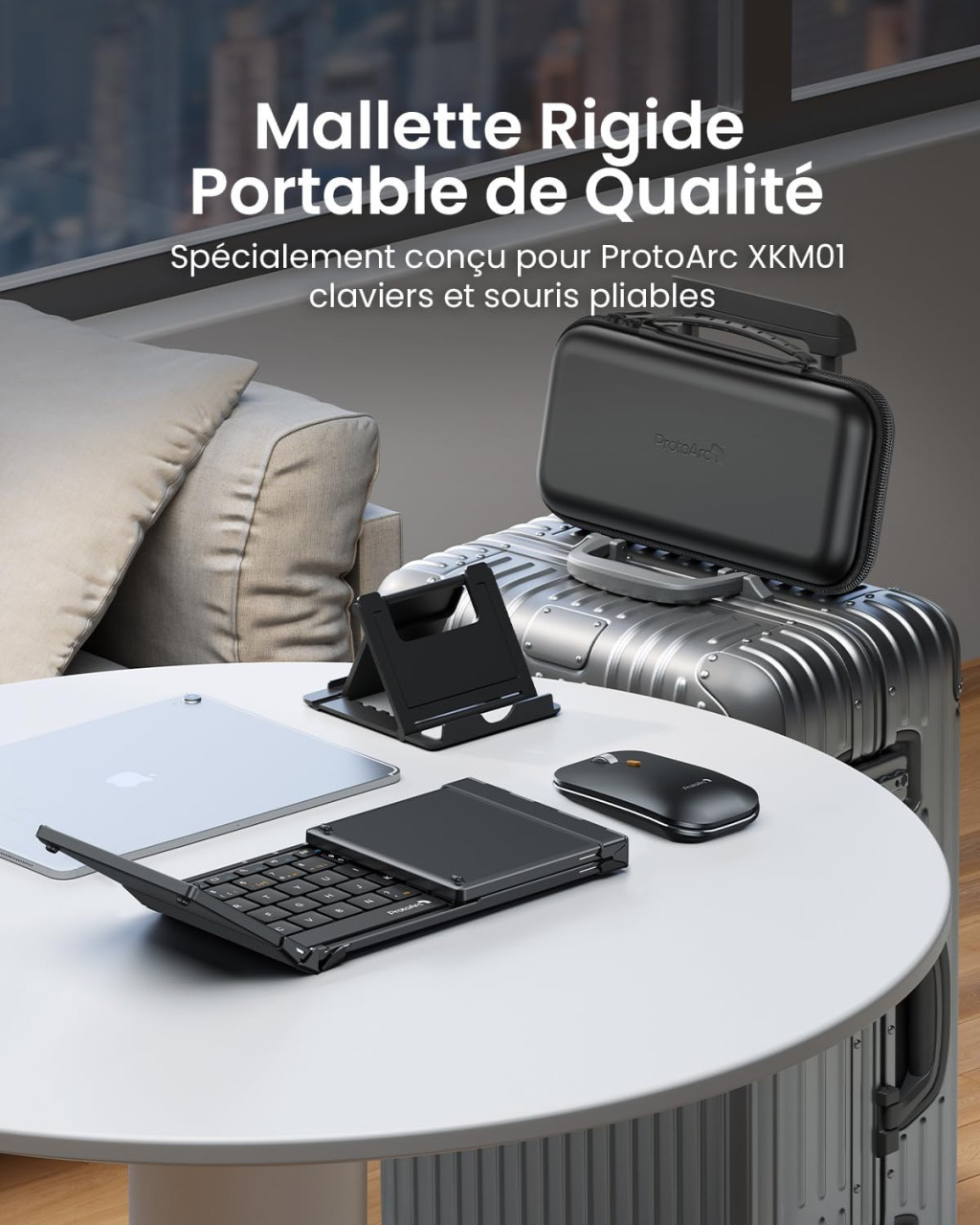 A ProtoArc XKM01 szett teljes utazási megoldást kínál. A csomag tartalmazza a billentyűzetet, az egeret, a Type-C töltőkábelt, valamint egy praktikus tárolótokot (12 x 5,5 x 1,6 hüvelyk), amely védi az eszközöket és nem foglal sok helyet a hátizsákban. Az integrált telefontartó 4-11 hüvelykes eszközöket támogat, így iPhone-tól az iPad Pro-ig minden megoldott.