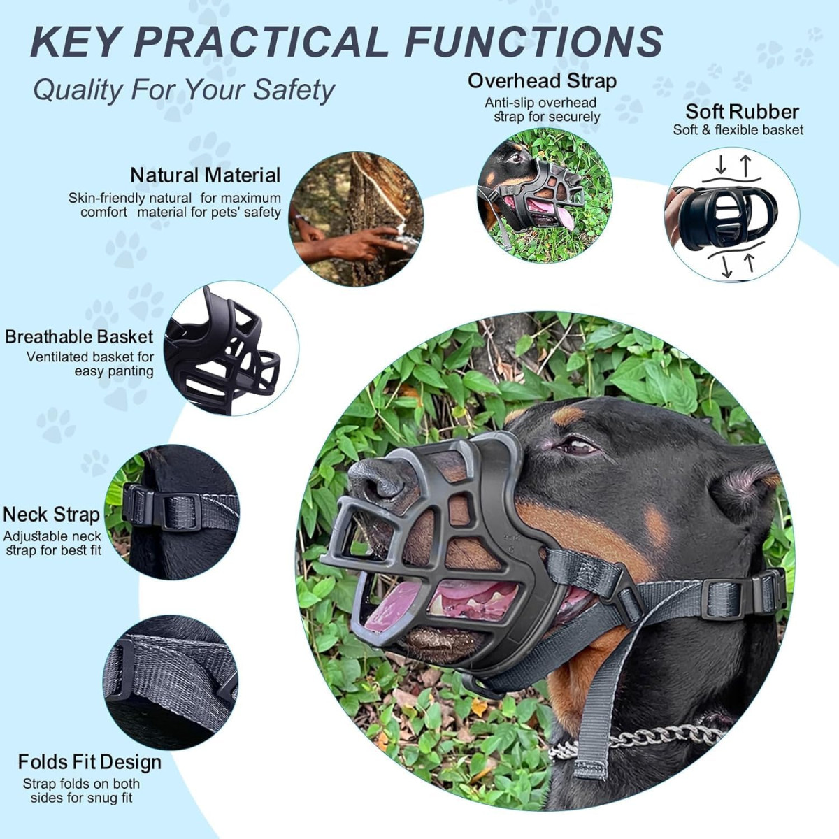 - Dizajn košare: Otvorena struktura košare omogućuje slobodno pijenje i jelo, istovremeno sprječavajući ugrize, žvakanje i jedenje.