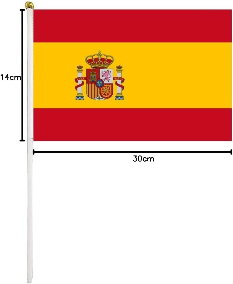 Ovaj set od 50 španjolskih zastava idealan je izbor za sve proslave, sportske događaje i društvene priredbe. Svaka zastava je dimenzija 21 x 14 cm i ima 30 cm dugačku plastičnu dršku za zastavu koja se lako drži. Živopisan dizajn španjolske zastave zajamčeno će privući pozornost, bilo da se radi o vjenčanju, rođendanskoj zabavi, školskoj priredbi ili nogometnoj utakmici.