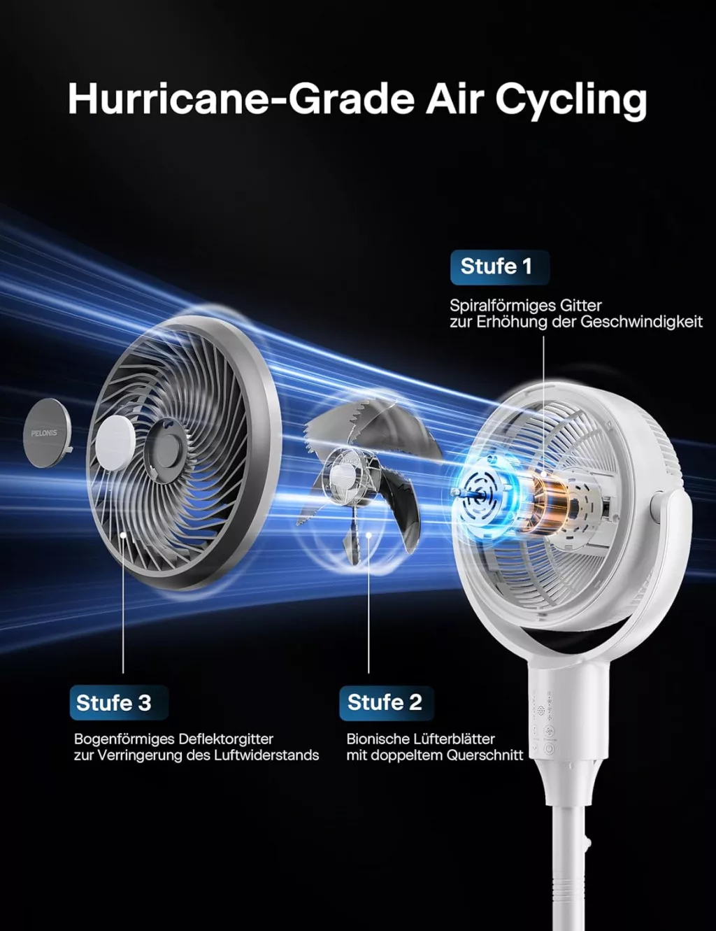 • 3D Oscilirajuća Glava: 135° + 90° omnidirektna oscilacija osigurava cirkuliranje zraka u svim smjerovima. Vertikalno i horizontalno kretanje djeluju istovremeno, tako da svježi zrak dopire do bilo koje točke u sobi.