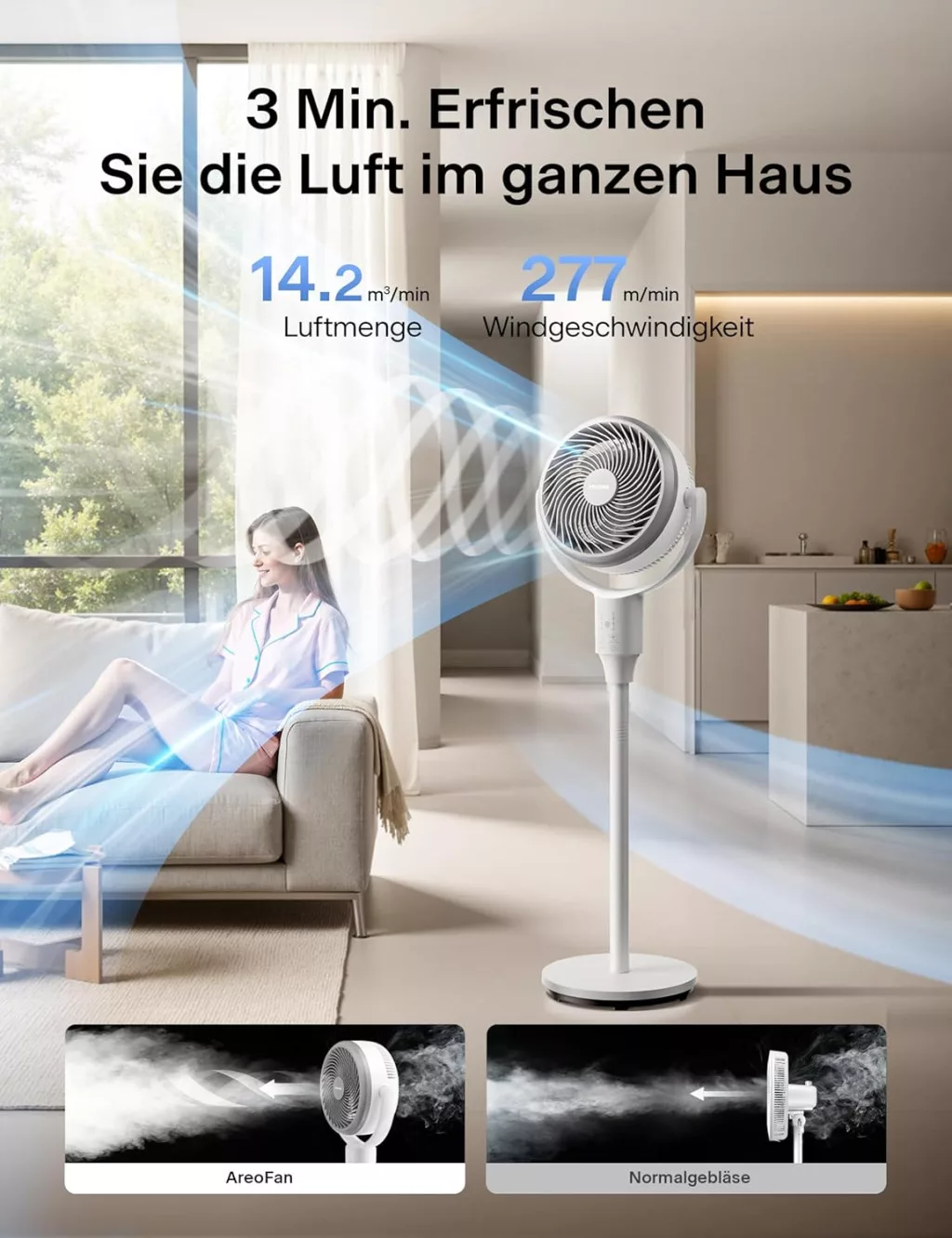 S protokom zraka od 1500 m³/h, uređaj osigurava brzo i učinkovito cirkuliranje zraka u cijeloj prostoriji. Kombinacija snažnog motora i inovativnog dizajna krila jamči tihi rad, tako da ne ometa rad ili odmor.