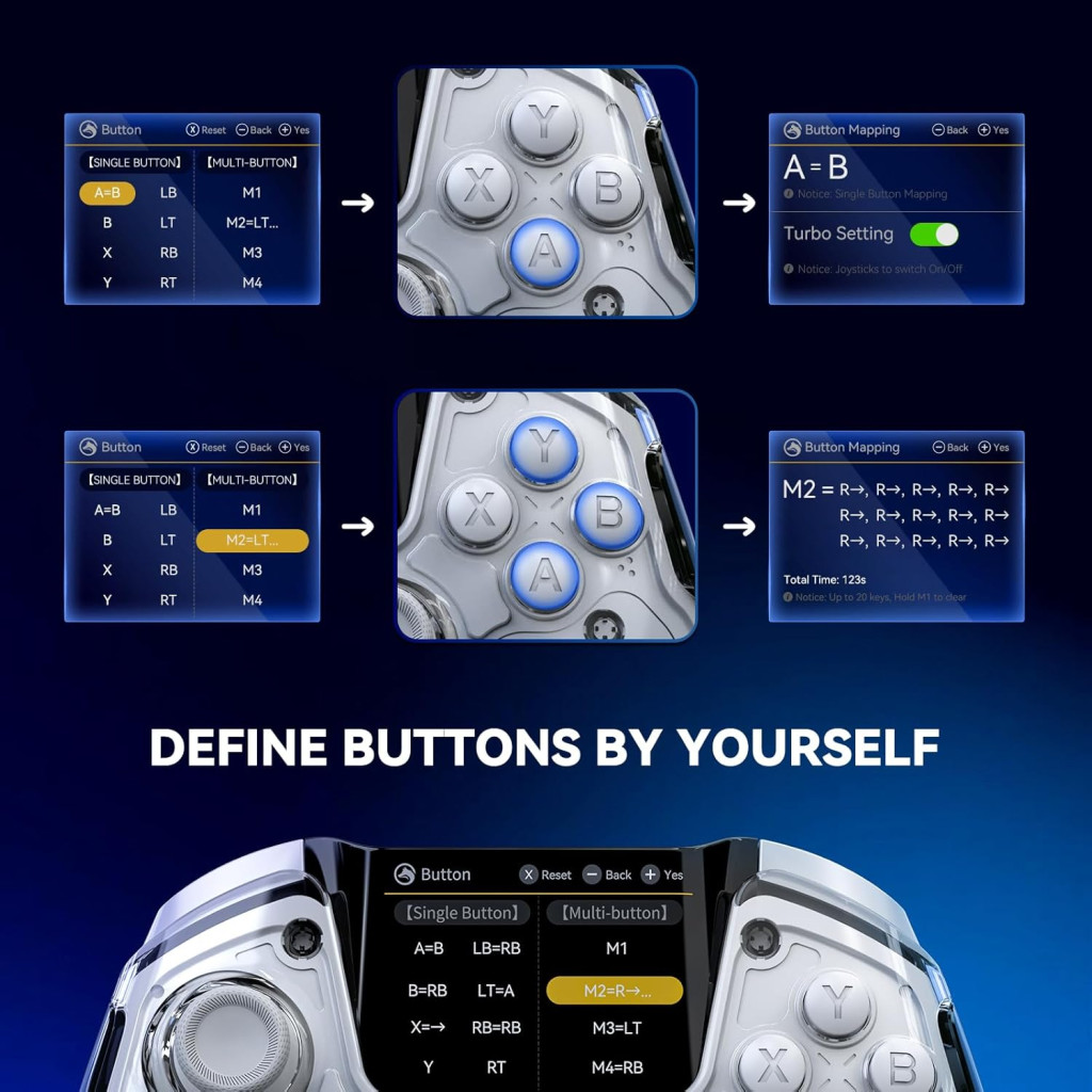 ManbaOne kontroler koristi najmoderniju Hall Effect joystick tehnologiju, koja osigurava rad bez drifta i dugi vijek trajanja. Baterija od 1800 mAh pruža dovoljno energije za duge sesije igranja, dok magnetska stanica za punjenje omogućuje brzo i praktično punjenje. Interaktivni zaslon prikazuje postavke kontrolera u stvarnom vremenu, tako da nije potrebna posebna aplikacija ili upravljački program.