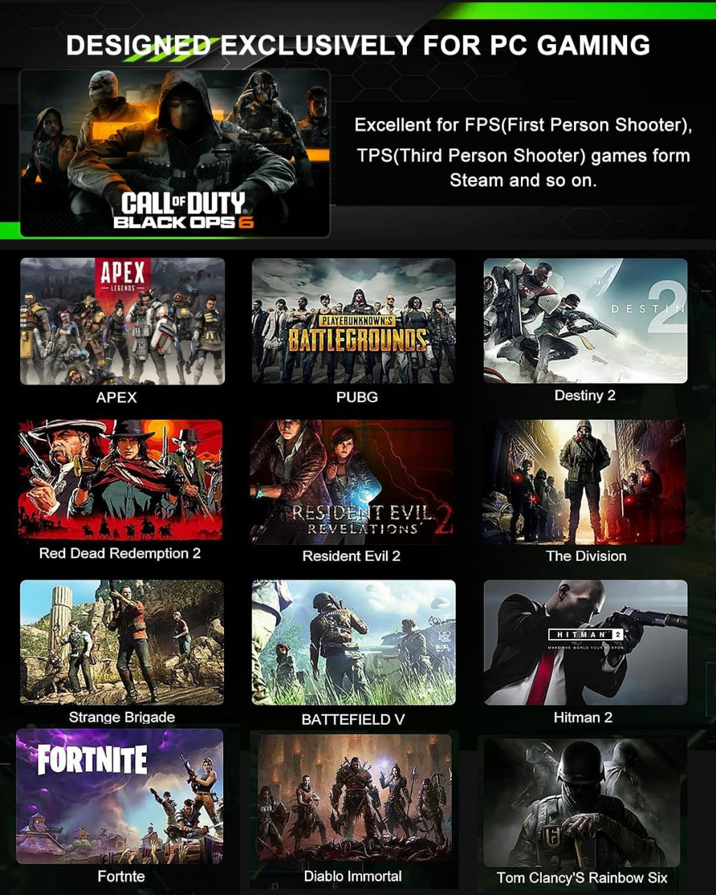 Call of Duty, Apex Legends, Valorant, Counter-Strike 2 és hasonló versenykörnyezeti lövöldözős játékokhoz.