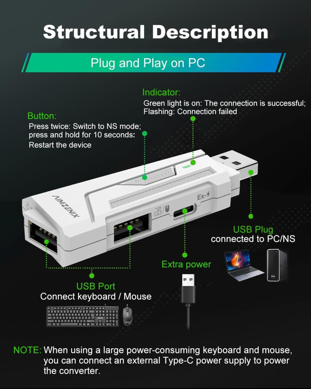️ Fontos Megjegyzés: Az adapter nem támogatja a vezeték nélküli egéreket és billentyűzeteket. Ha az egér túl nagy energiafelvételű, szükség lehet külső tápellátásra. A Nintendo Switch-hez OTG adapterre van szükség.