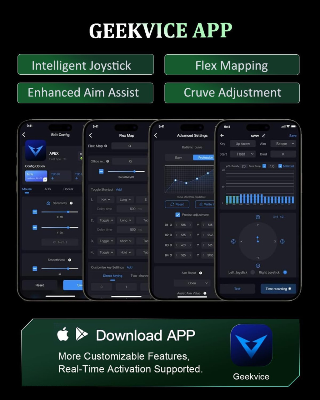 - Valós Idejű Testreszabás: A GEEKVICE mobilalkalmazás segítségével teljes kontroll a makrók, billentyűleképezés és aimbot beállítások felett.