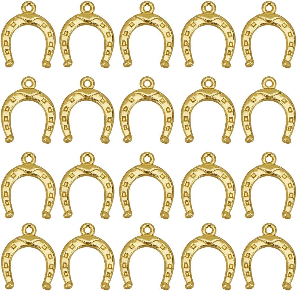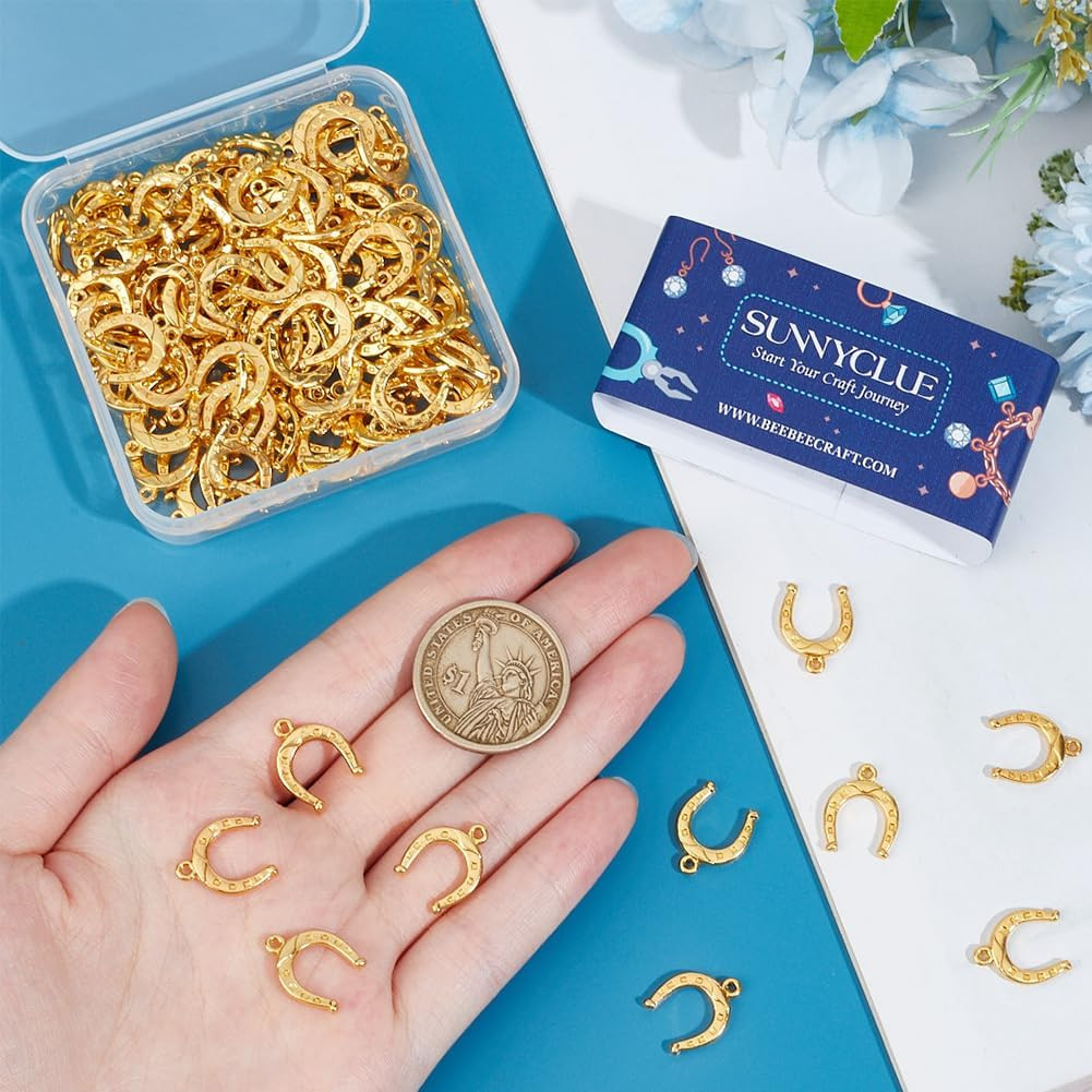 SUNNYCLUE set privjesaka u obliku potkova izvrstan je izbor za one koji vole vintage kaubojski stil i izradu nakita. Ova kolekcija od 120 komada savršena je osnova za izradu ogrlica, narukvica, naušnica i drugih kreativnih projekata nakita. Privjesci od zlatne legure nisu samo lijepi, već su i izdržljivi te dugo zadržavaju svoj sjaj.
