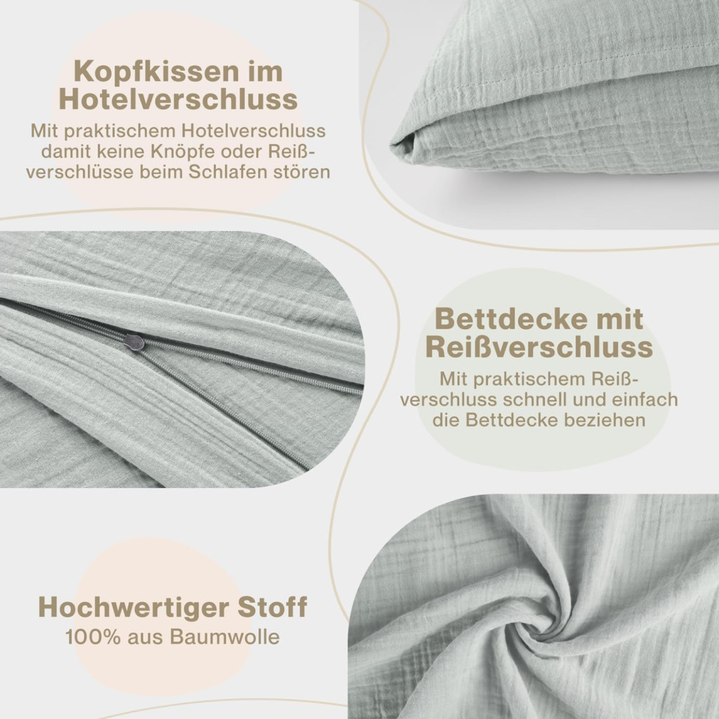 A 100% pamutból készült muszlin szövet egyedülálló kombinációja a puhaságnak és a légáteresztőképességnek. Ez azt jelenti, hogy nyáron hűvös marad, télen pedig kellemes meleg biztosít. Az ágynemű cipzárral van felszerelve, amely megkönnyíti a felhelyezést és a levétést, így nem kell többé küzdeni az ágyneművel.