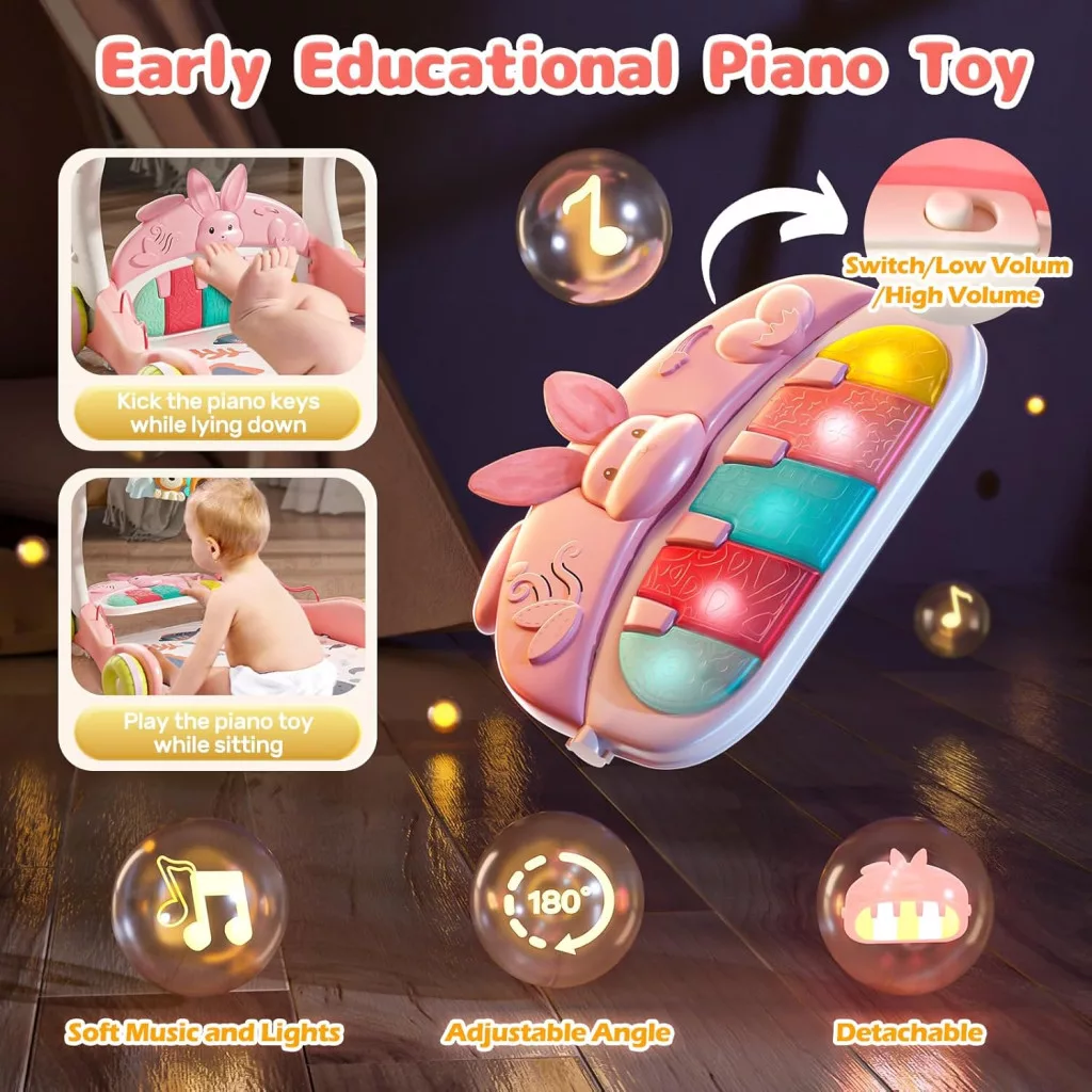 • Podesiva klavirska tipkovnica: Kada beba svira tipke, reproduciraju se zanimljivi zvukovi, a gumbi svijetle, razvijajući glazbeni osjećaj. Klavir se može koristiti u ležećem i sjedećem položaju.