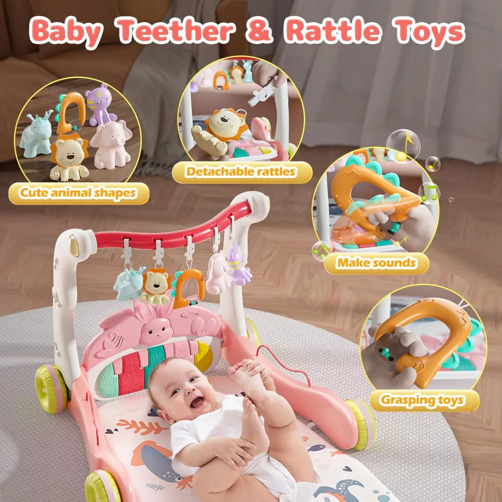 Od rođenja: Na mekanoj, prozračnoj podlozi za igru beba može udobno ležati na leđima, dok šarene, viseće igračke potiču vid i pokrete ruku. Razdoblje ležanja na trbuhu: Posebno dizajnirani jastuk podržava vježbe "tummy time", jačajući mišiće vrata i ramena, što je neophodno za kasniji motorički razvoj. Sjedeći položaj: Kada beba već može sjediti, glazbeni klavir se može koristiti iz nove perspektive, razvijajući koordinaciju ruku i očiju te glazbeni osjećaj. Razdoblje učenja hodanja: Stabilna funkcija hodalice pruža sigurnu potporu za poduzimanje prvih koraka, dok se podesivi kotači prilagođavaju bebinom tempu razvoja. Igračka nudi nove izazove i iskustva u svakoj fazi razvoja, tako da ostaje omiljena bebi dulje vrijeme. Šareni dizajn, glazbeni elementi i različite teksture doprinose senzornom razvoju bebe. ????