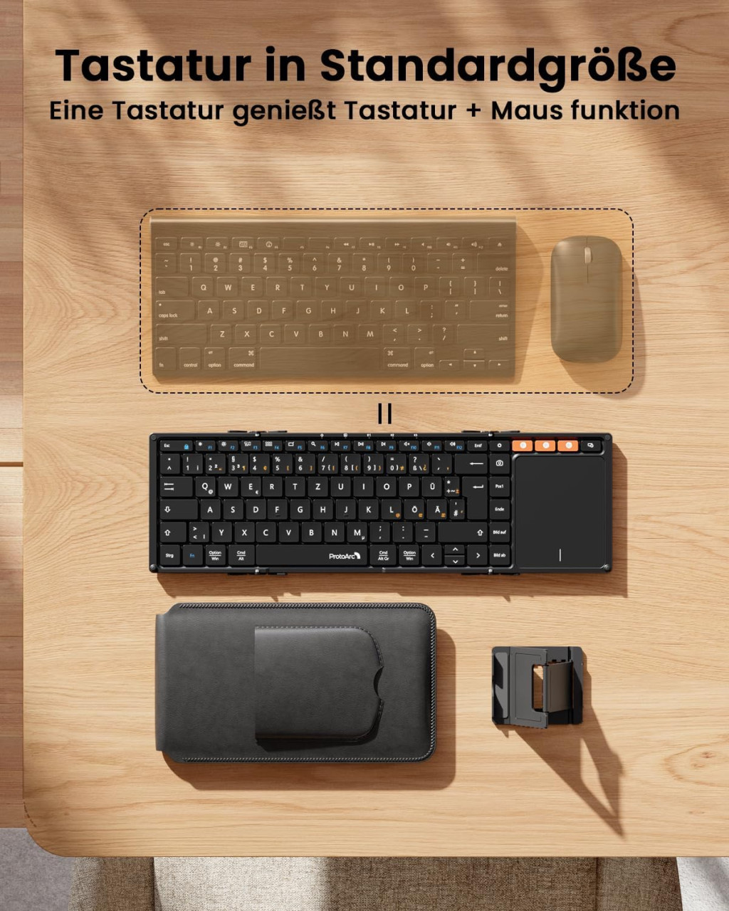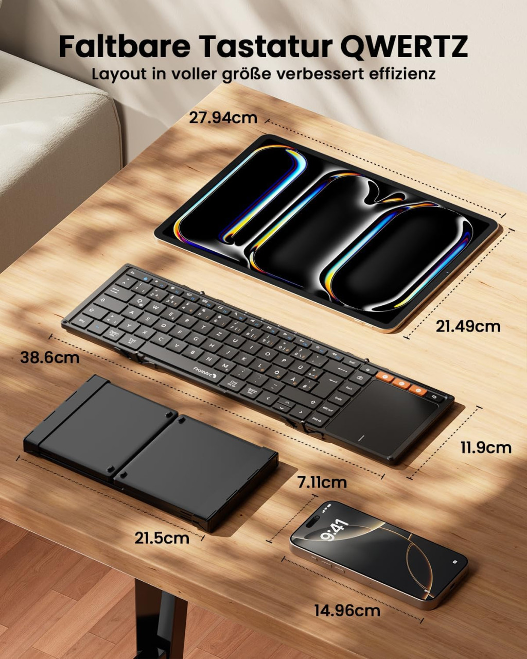 ProtoArc XK01 TP Összehajtható Bluetooth Billentyűzet Érintőpaddal - QWERTZ Német Kiosztás, iPad/iOS/Android/Windows Kompatibilis, Fekete