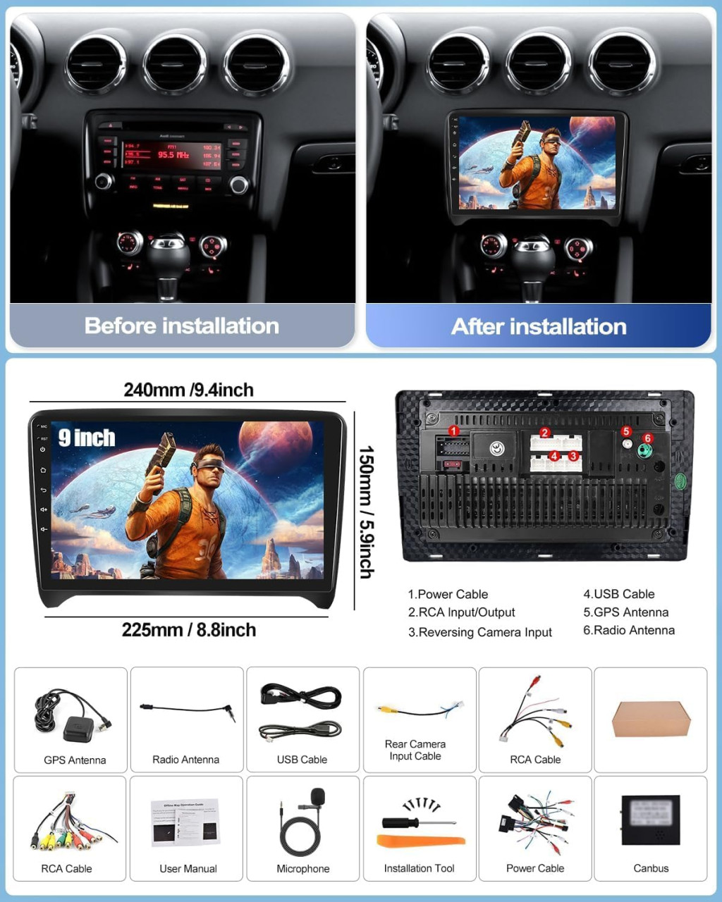 Instalacija autoradia je relativno jednostavna, ali se preporučuje zatražiti profesionalnu pomoć za optimalne performanse. Uređaj je 2 Din veličine, što odgovara mjestu originalnog radija Audija TT 8J MK2. Veze su standardni RCA i USB priključci koji su kompatibilni s električnim sustavom automobila. Nakon prvog pokretanja, sustav automatski prepoznaje parametre automobila i postavlja potrebne funkcije. Tvornička lozinka je 1234, a Bluetooth lozinka je 00000.
