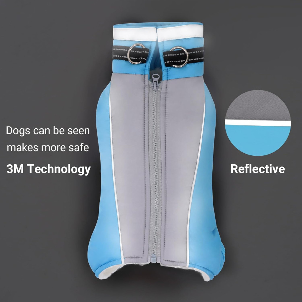 A kabát egyedi dizájnja reflektív csíkokkal rendelkezik, amelyek éjszaka és rossz látási viszonyok között biztosítják kutyája biztonságát. A könnyű, szellőző anyag és az ergonomikus szabás lehetővé teszi a szabad mozgást, míg a cipzáras kialakítás gyors és egyszerű fel- és levételést tesz lehetővé.