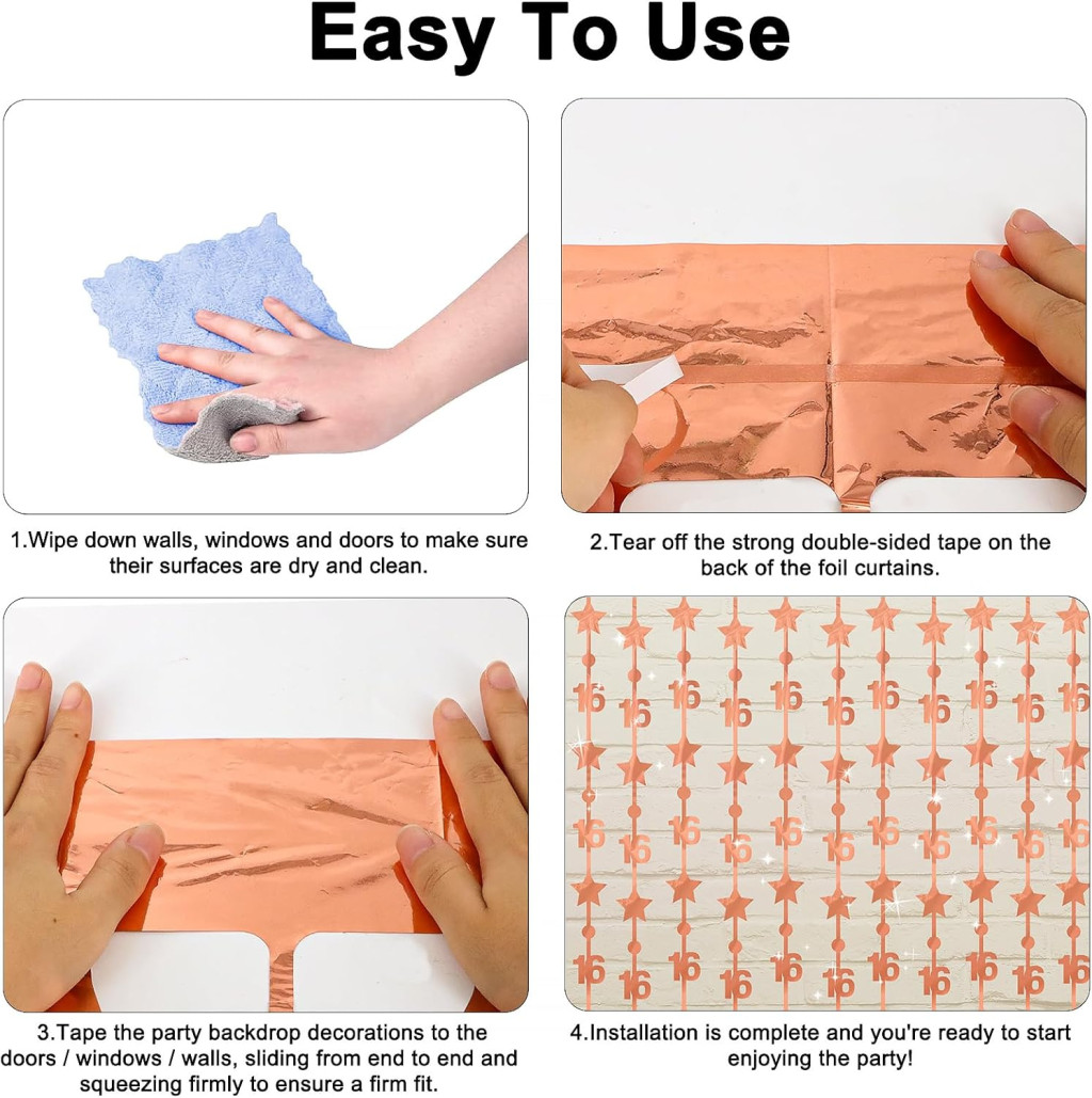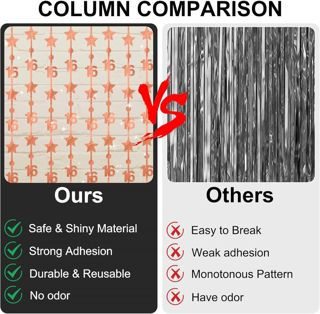 Összehasonlítás más dekorációkkal: Az egyszerű papír függönyökhöz képest ez a fólia dekoráció sokkal tartósabb és elegánsabb. A hagyományos szülinapi dekorációkkal szemben a rose gold szín és a csillogó felület modern és luxus hatást kelt. Más fólia függönyökhöz képest az egyedi 16-os szám és csillag dizájn ezt a terméket különlegessé teszi.