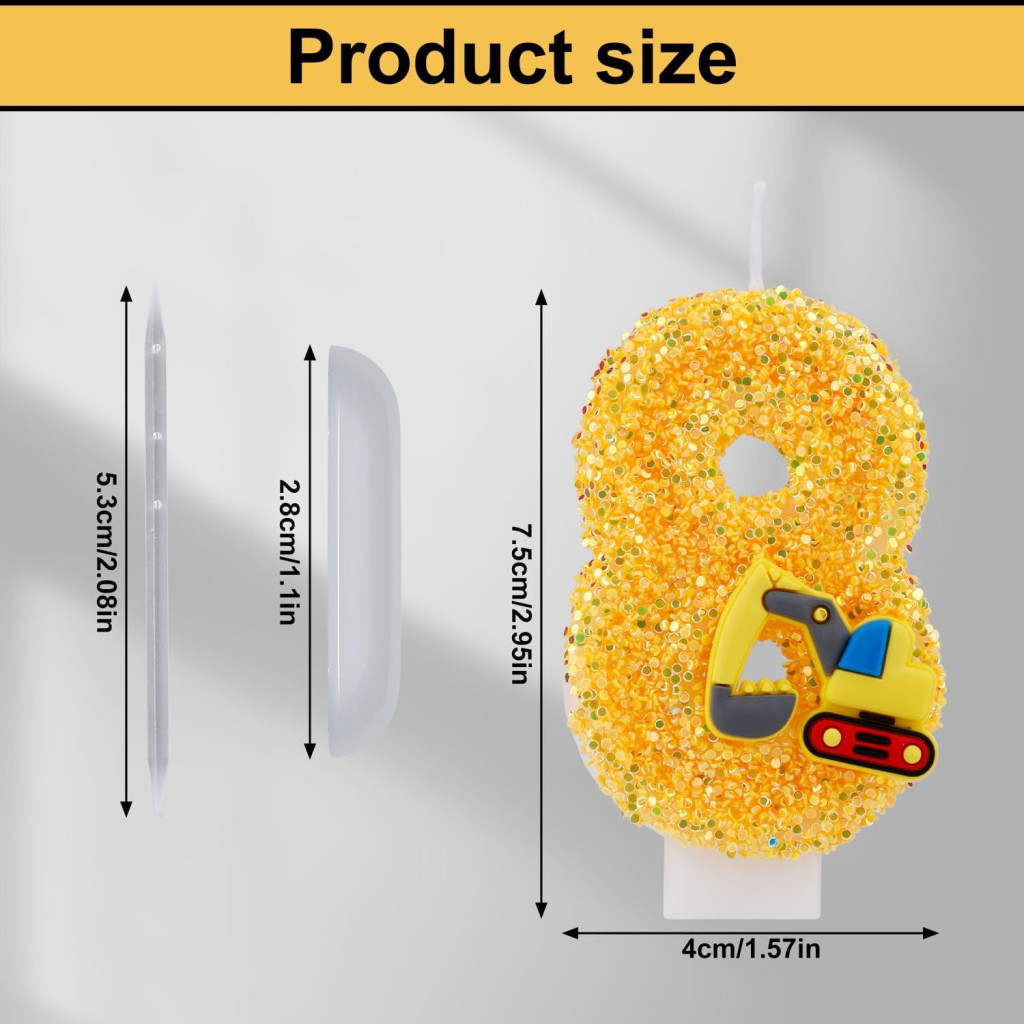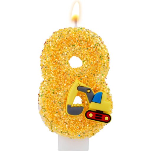 Rođendanska svijeća za građevinsku tematiku - Žuta svjetlucava svijeća u obliku kamiona s brojem 8 Rođendanska svijeća za građevinsku tematiku - Žuta svjetlucava svijeća u obliku kamiona