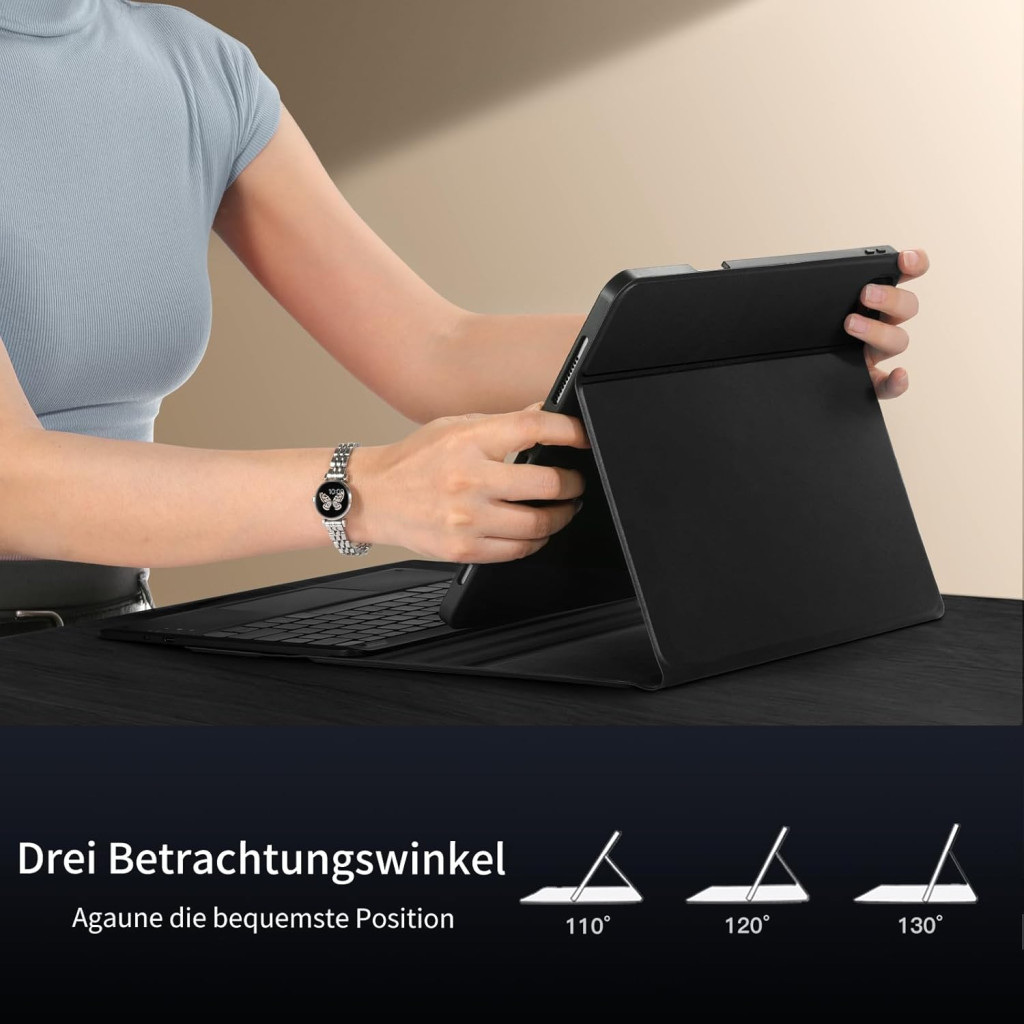 A Vobafe iPad Air 13 és iPad Pro 12.9 billentyűzet tok egy prémium minőségű, multifunkcionális megoldás, amely tökéletes kombinációja a védelemnek és a produktivitásnak. Ez a termék nem csupán egy egyszerű tok, hanem egy teljes munkaállomás, amely lehetővé teszi a professzionális munkavégzést bárhol, bármikor. Az integrált QWERTZ billentyűzet, a precíz multi-touch trackpad és a 7 színű LED háttérvilágítás együttesen biztosítják a kényelmes és hatékony munkavégzést.