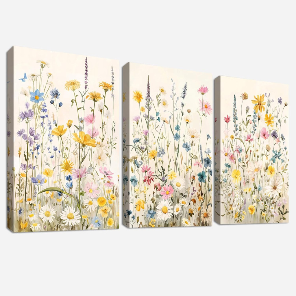 A HALFLEMART 3 részes vászon képkészlet élénk százszorszépekkel és virágokkal díszíti otthonát: