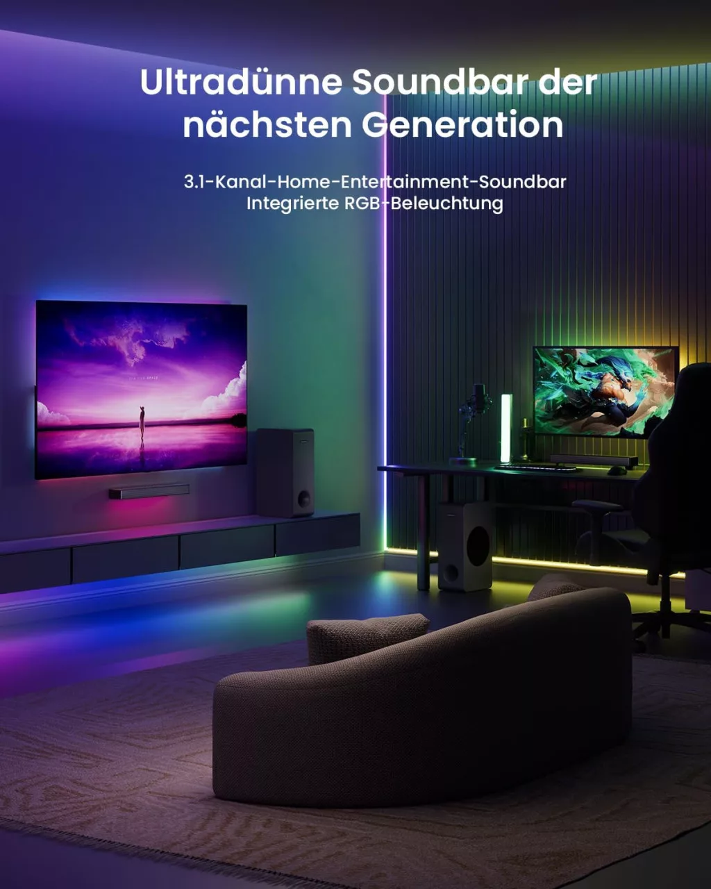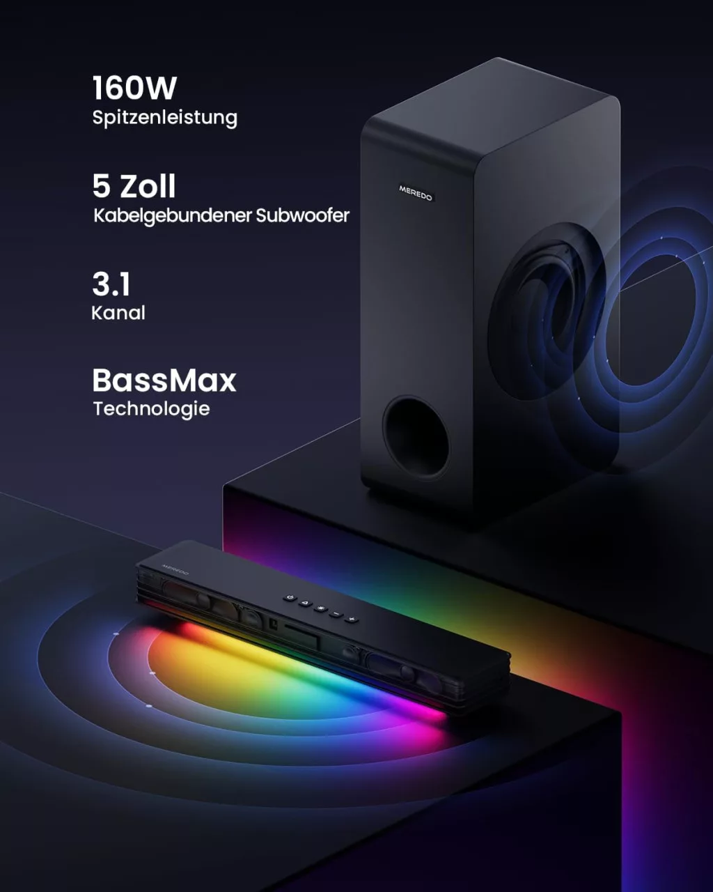 MEREDO G38 je moderan 3.1 kanalni soundbar koji podiže kućnu zabavu na potpuno novu razinu. Ovaj premium audio sustav ima snagu od 160W, integriranu RGB LED sinkronizaciju i svestrane mogućnosti povezivanja. Bilo da ga povezujete s televizorom, računalom, igraćom konzolom ili pametnim telefonom, MEREDO G38 jamči impresivno audio iskustvo. Ultra-tanki profil od 39,9 mm osigurava elegantan izgled, dok 5-inčni subwoofer pruža duboke basove.