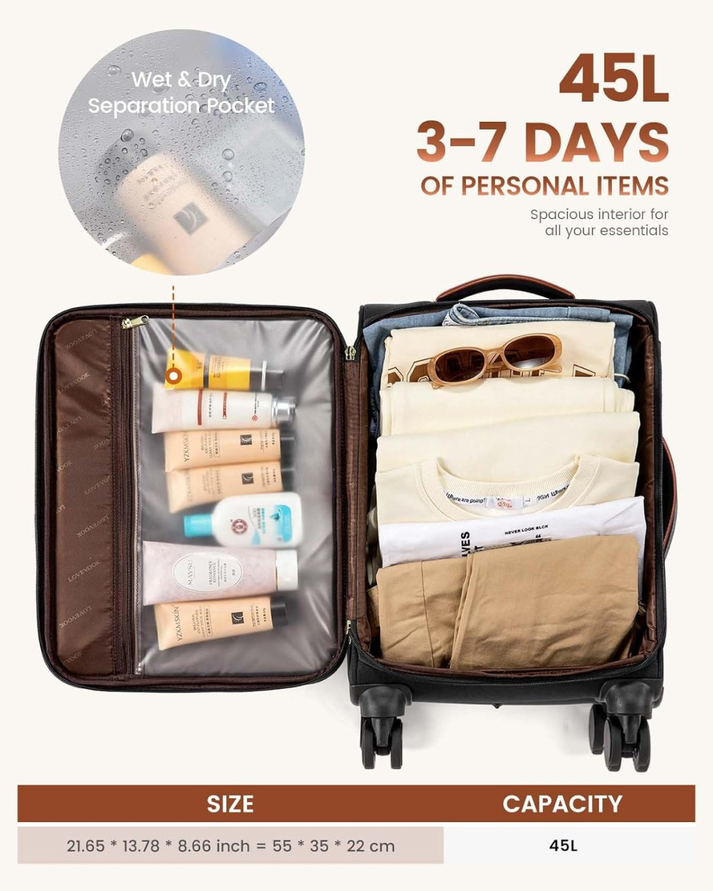 A LOVEVOOK bőrönd méretei (55 x 35 x 22 cm) szinte minden nagyobb légitársaság kézipoggyász szabályainak megfelelnek. A rugalmas softshell kialakítás lehetővé teszi a könnyű behelyezést még szűk helyekre is.