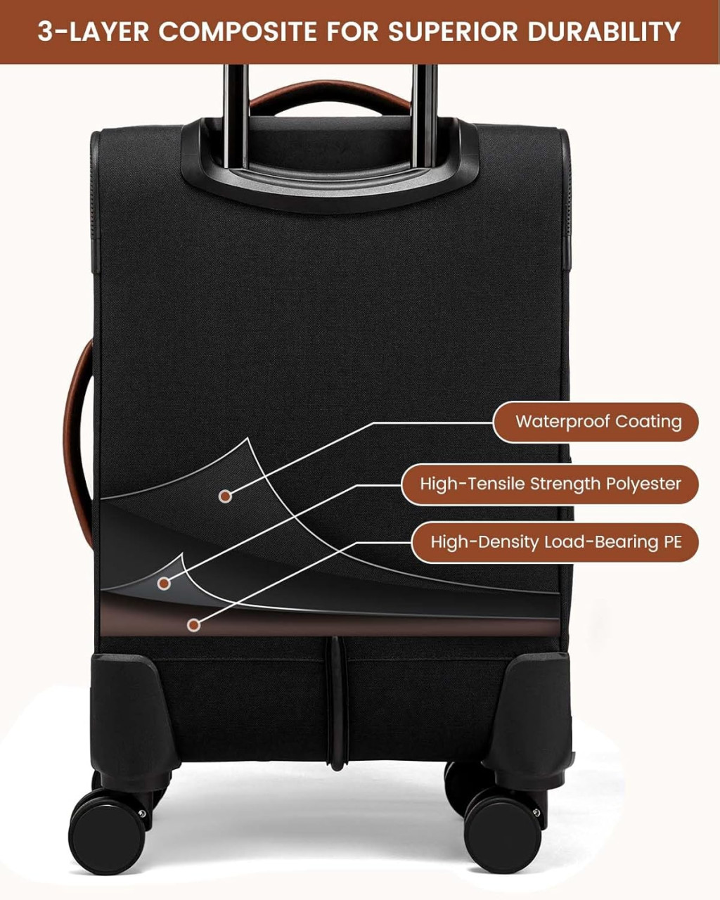 A bőrönd robusztus, ütésálló poliészter anyagból készült, amely nagyobb védelmet nyújt, mint a hagyományos kemény kofferek. Az anyag könnyű, mégis rendkívül ellenálló az időjárási viszonyoknak és a szállítás során bekövetkező ütéseknek.