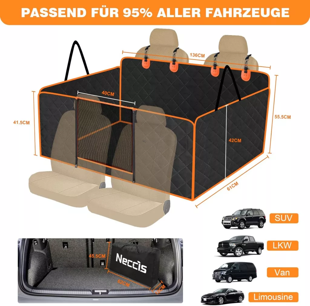 A Neccis kutyatakaró különleges kialakítása lehetővé teszi, hogy a hátsó ülés egy részét lehajtsa, így akár gyermekülés is elhelyezhető mellette. Az erősített pántos csatok maximális stabilitást biztosítanak, így kutyája biztonságban érezheti magát, miközben Ön nyugodtan vezet a városban vagy a hegyekben.