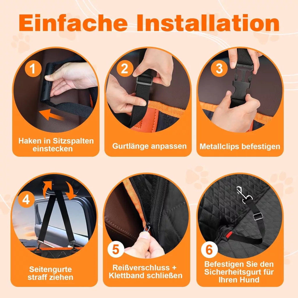 A takaró rögzítése rendkívül egyszerű az erősített pántos csatoknak köszönhetően, amelyek stabilan tartják a védőhuzatot még aktív kutyák esetén is. A biztonsági övek továbbra is hozzáférhetőek maradnak, így semmi sem akadályozza az utasok biztonságos utazását.