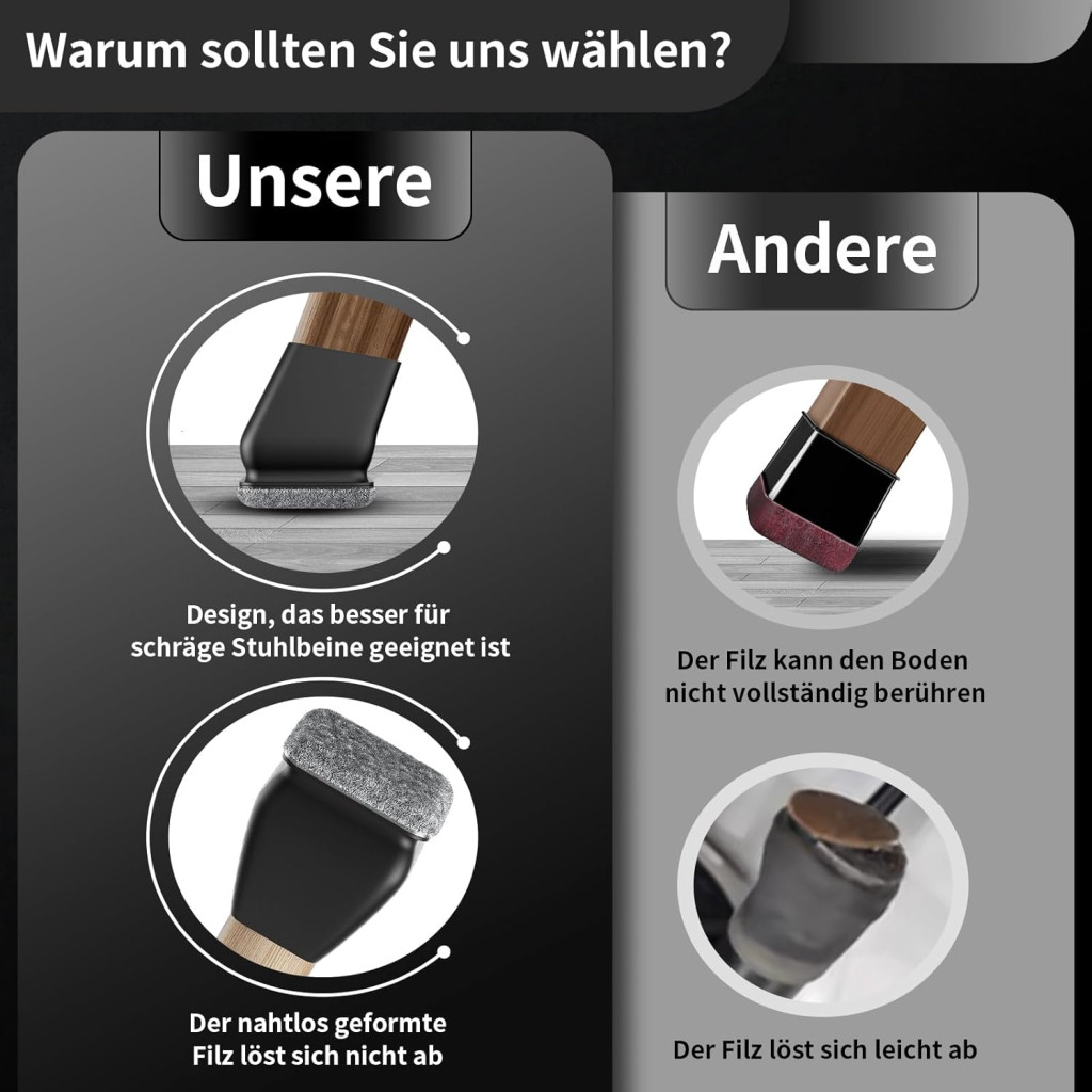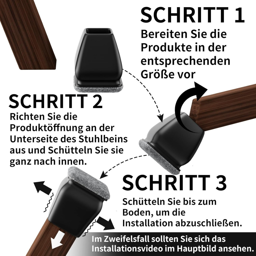 Fontos megjegyzés: A telepítés előtt gondosan mérje meg a szék lábainak átmérőjét. A termék négyzet alakú szék lábakhoz optimalizált, de az elastikus anyag miatt kerek lábakhoz is használható. 15 foknál nagyobb szögben hajlított szék lábak esetén a filc párnázat nem tapad teljesen a padlóhoz.