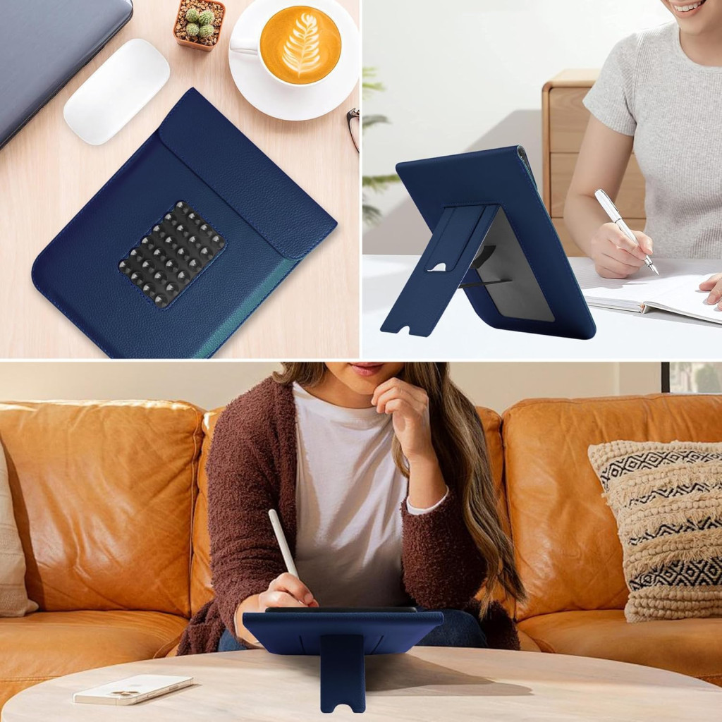 A szívócsalád funkció különösen hasznos, ha az asztalon vagy más felületen szeretné rögzíteni az eszközt, míg a többszögű állvány tökéletes az ágyon vagy kanapén való olvasáshoz. Az elegáns sötétkék szín professzionális megjelenést kölcsönöz, így irodai vagy üzleti környezetben is megfelelő.