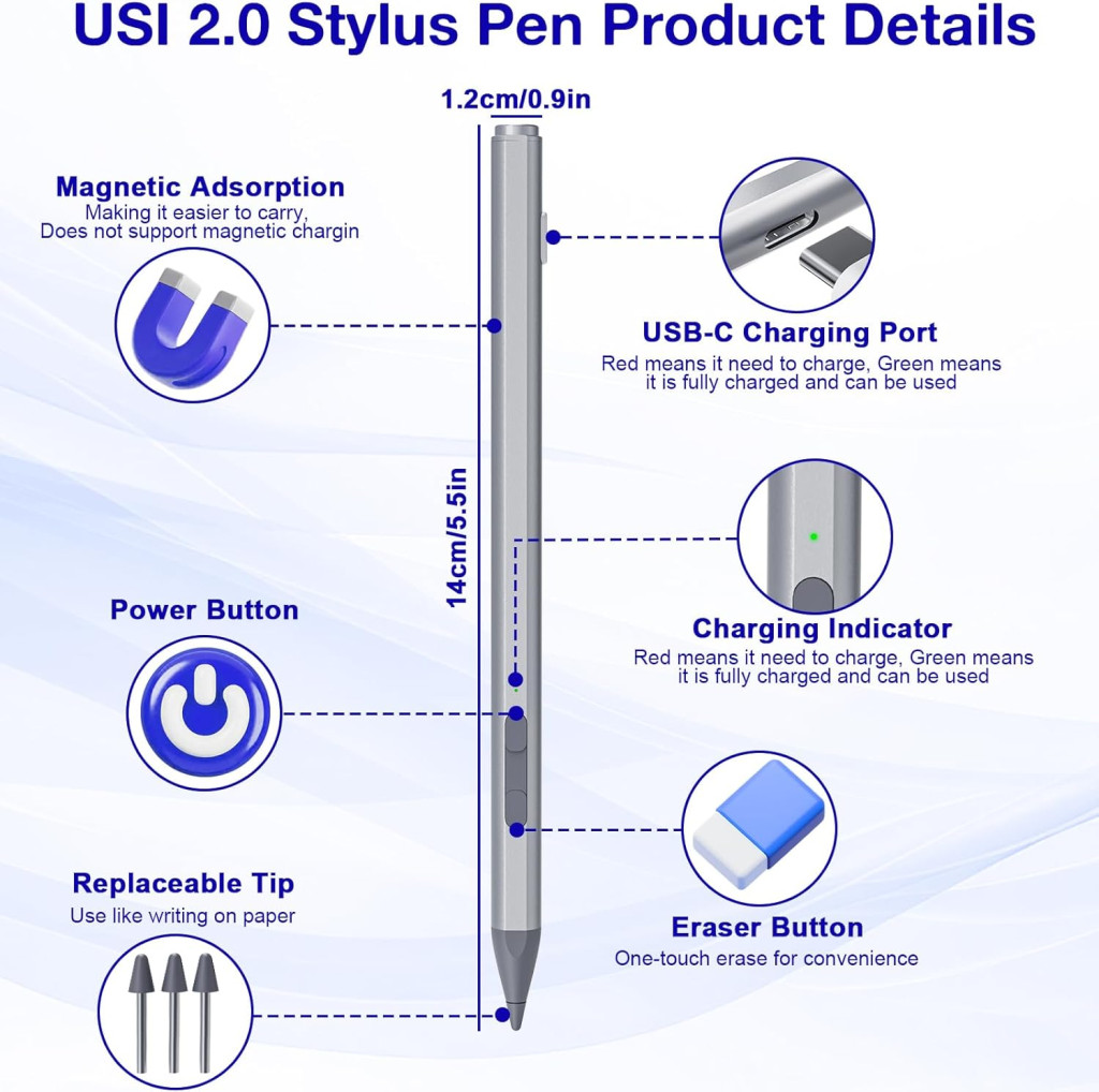 Az USI 2.0 Stylus Pen rendkívül egyszerű a használatban. Nincs szükség illesztőprogramra vagy Bluetooth párosításra. Egyszerűen nyomja meg az eszköz bármelyik gombját, és azonnal kezdhet írni vagy rajzolni. Az automatikus kikapcsolás funkció 10 perc inaktivitás után aktiválódik, így megtakarítja az akkumulátor energiáját. A Type-C töltőkábel gyors feltöltést biztosít, és az LED kijelző jelzi az akkumulátor állapotát.