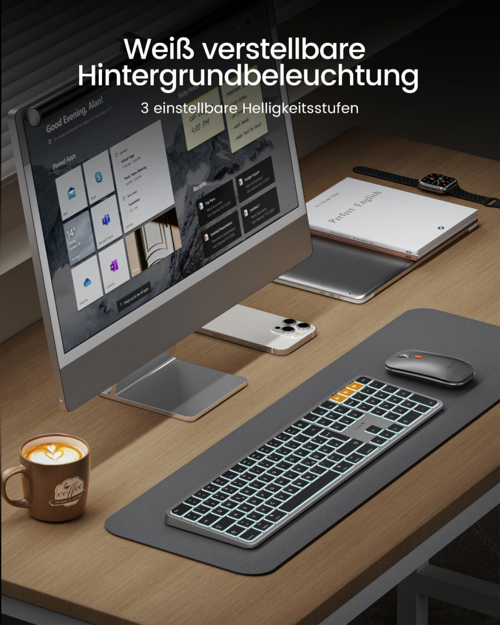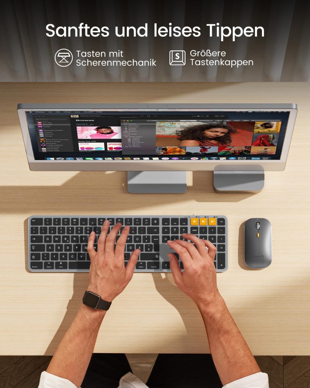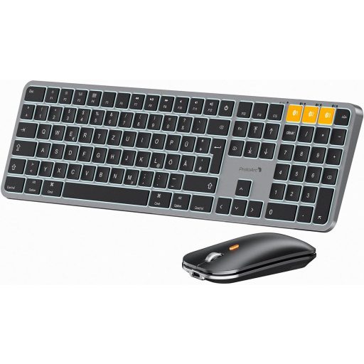 A ProtoArc KM100-A egy prémium minőségű, vezeték nélküli billentyűzet és egér kombináció, amely kifejezetten Mac felhasználók számára lett tervezve. Ez az elegáns szett teljes méretű QWERTZ német billentyűzettel rendelkezik, és három különböző eszközzel képes egyidejűleg csatlakozni Bluetooth technológia segítségével. Az ultramodern design és a kiváló funkcionalitás tökéletes kombinációja teszi ezt az ideális választássá MacBook Pro, MacBook Air, Mac Mini, iMac, iPad és iPhone felhasználók számára.