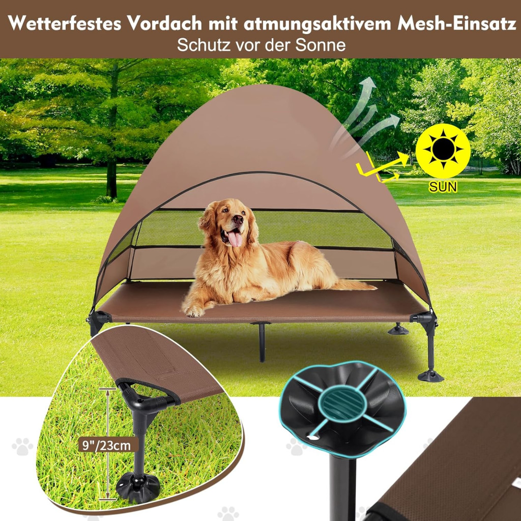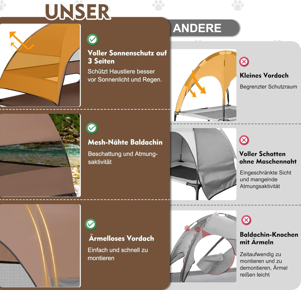 Krevet opremljen velikim vodootpornim krovom ne samo da pruža zaštitu od UV zračenja i kiše, već i osigurava više hlada od većine sličnih proizvoda dostupnih na tržištu. Mrežasti umetci s 3 strane jamče da se psi ne osjećaju zatvoreno i da je osigurana dobra cirkulacija zraka čak i tijekom najtoplijih ljetnih dana.