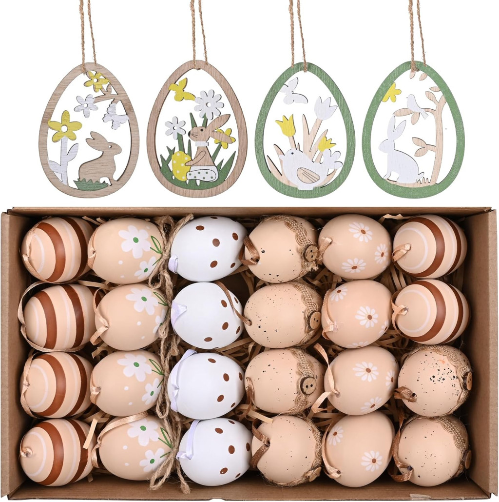 Szett tartalma: 24 tojás + 8 dekoratív függő + szalagok