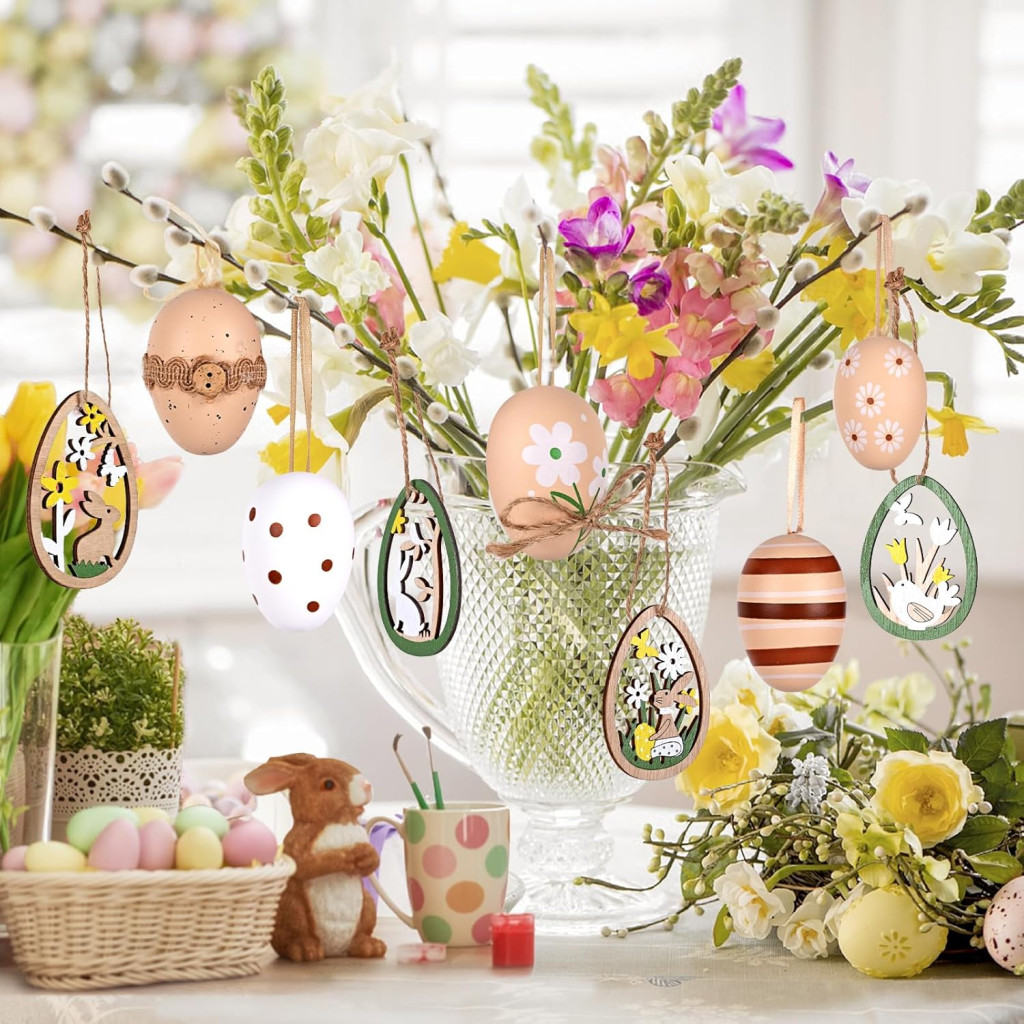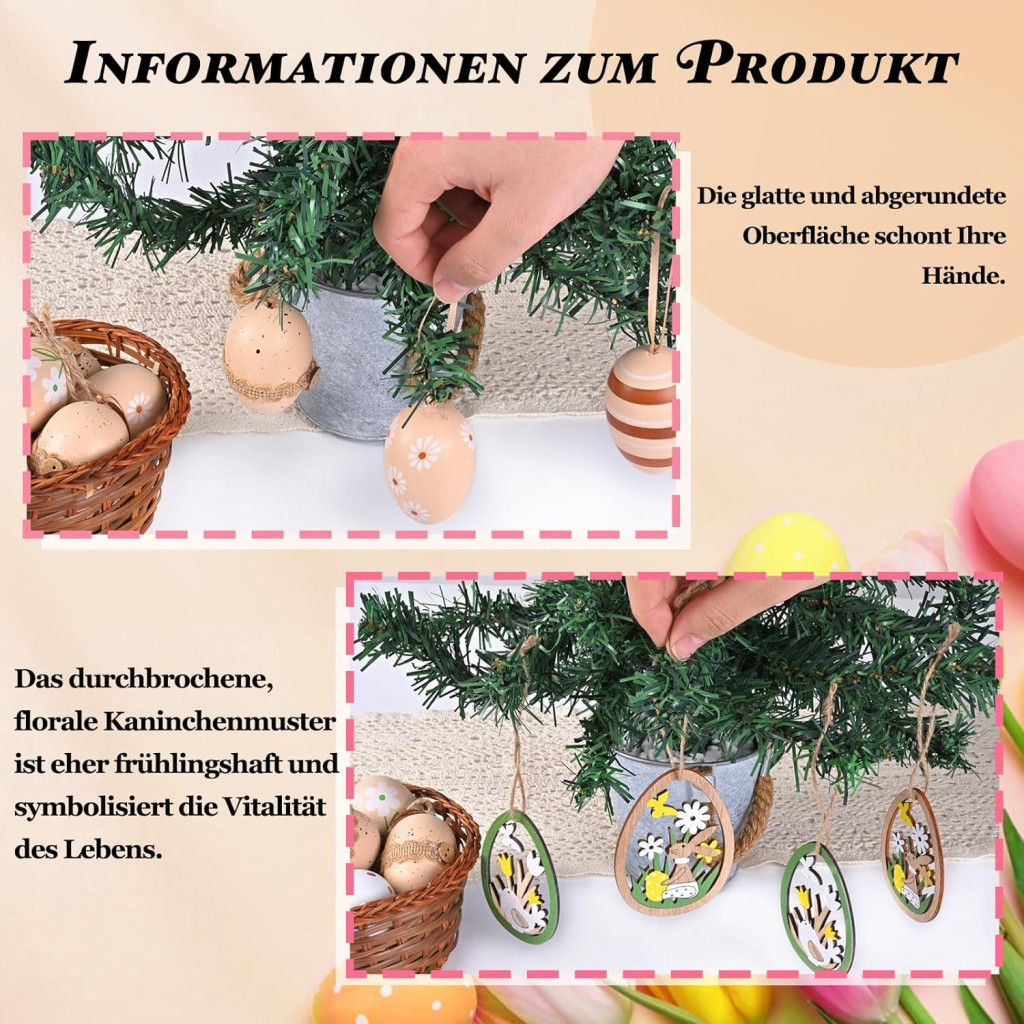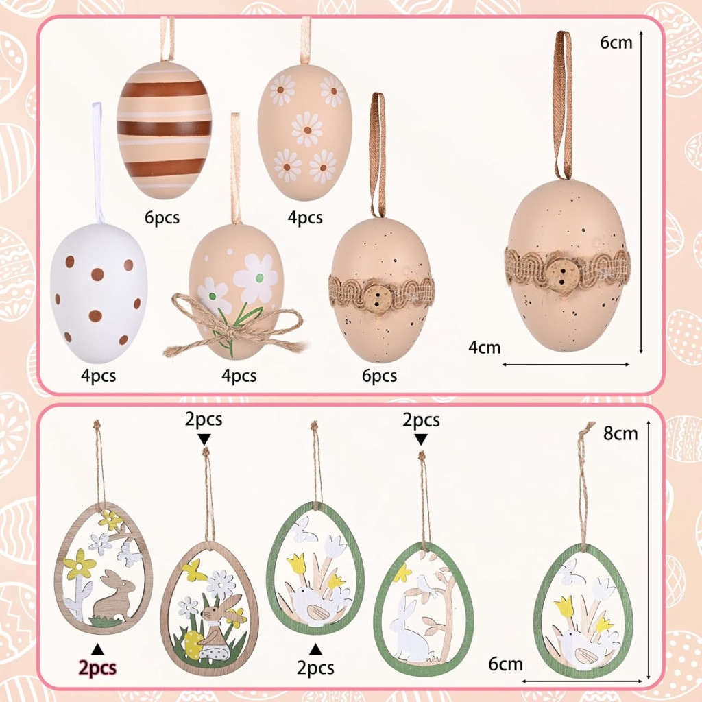 A dekoratív függők fából készültek, amelyek nyuszik, csibék és virágok formájában vannak kialakítva, így háromdimenziós és élethű megjelenést kölcsönöznek az egész szettnek. A tojások virágmintázattal, pöttyökkel és csíkokkal vannak díszítve, amelyek harmonikusan egymáshoz illeszkednek. Az összes sarok lekerekített, így biztonságosan használható a család minden tagja számára.
