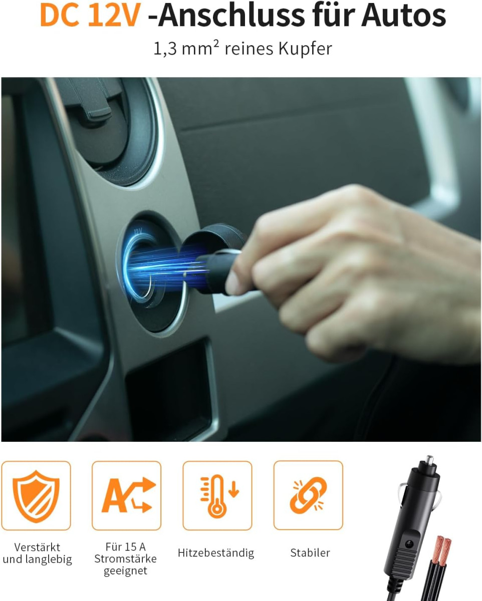 - DC 12V Auto Priključak: Izravno spajanje na upaljač u automobilu, može se koristiti bilo gdje