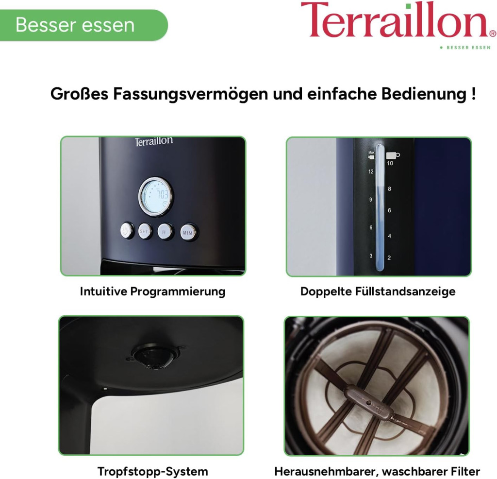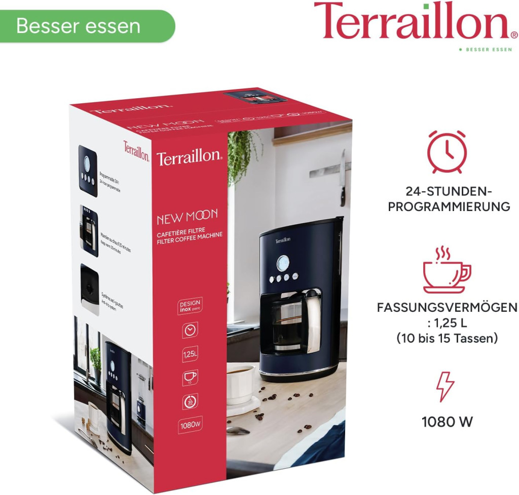 Terraillon - New Moon Programmable Electric Drip Coffee Maker Glass Jug 1080W Capacity 1.25L Keep Warm Function Anti Drip Removable Filter Painted Body