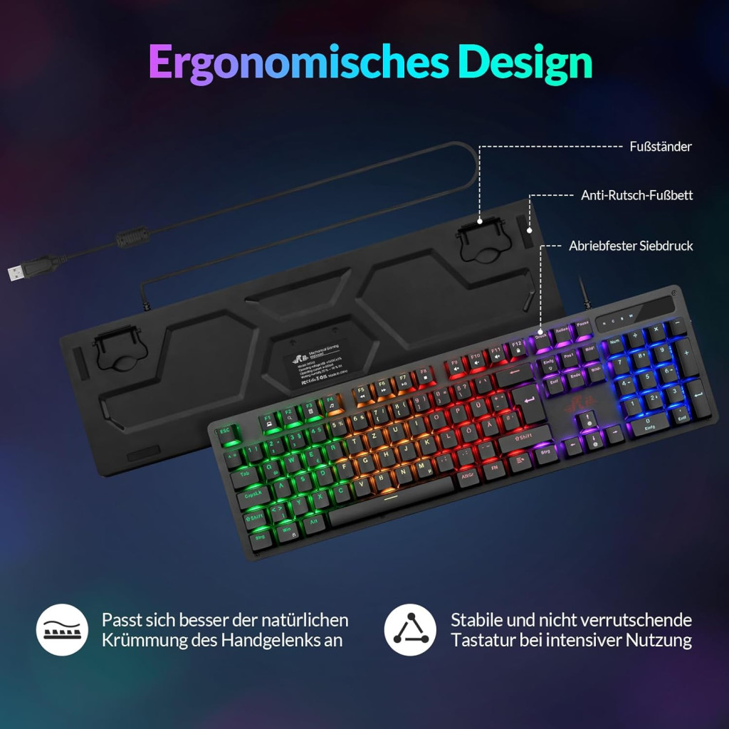 - Teljes Méretű Kialakítás: QWERTZ elrendezés, ergonomikus láb és gumipárnák a kényelmes használathoz