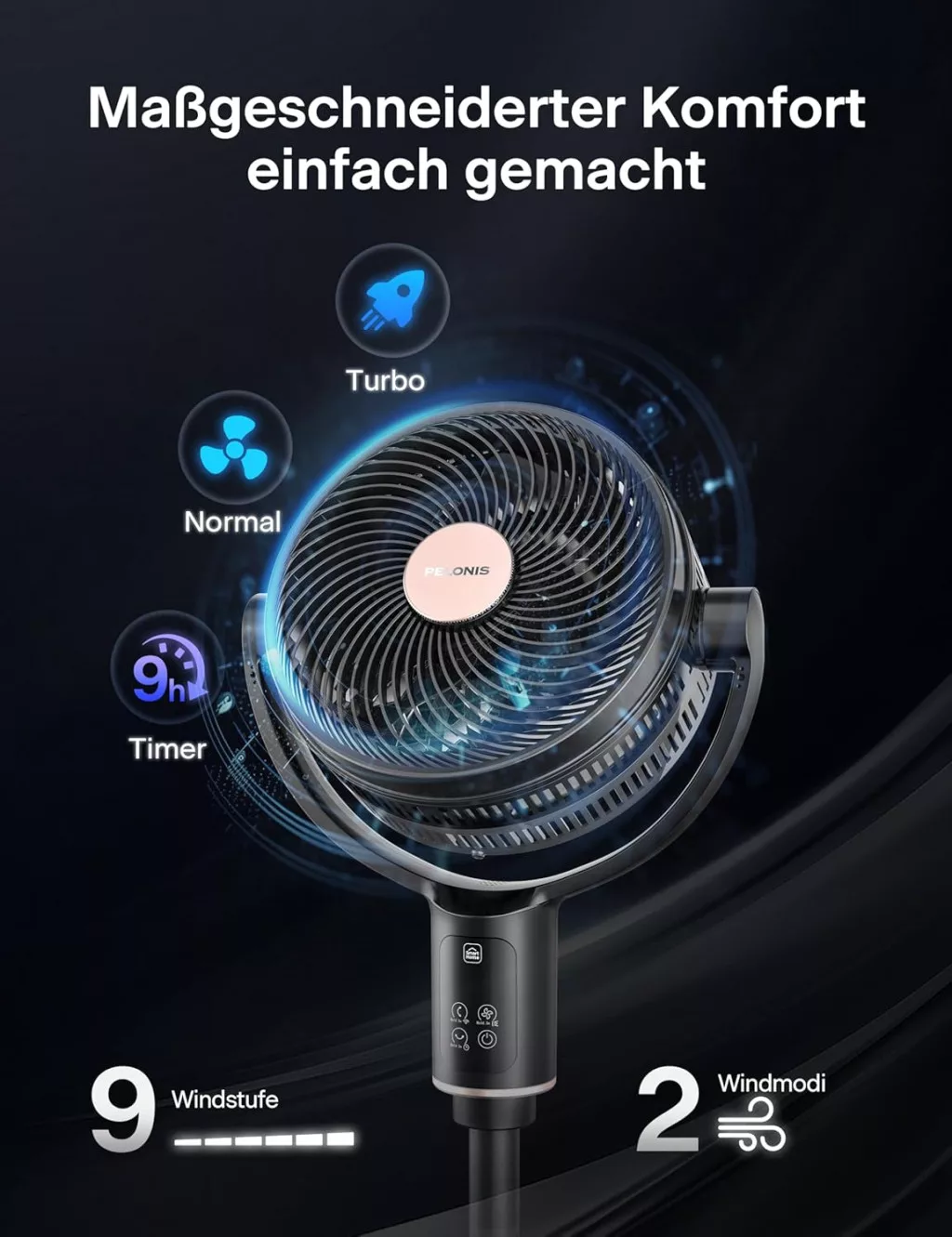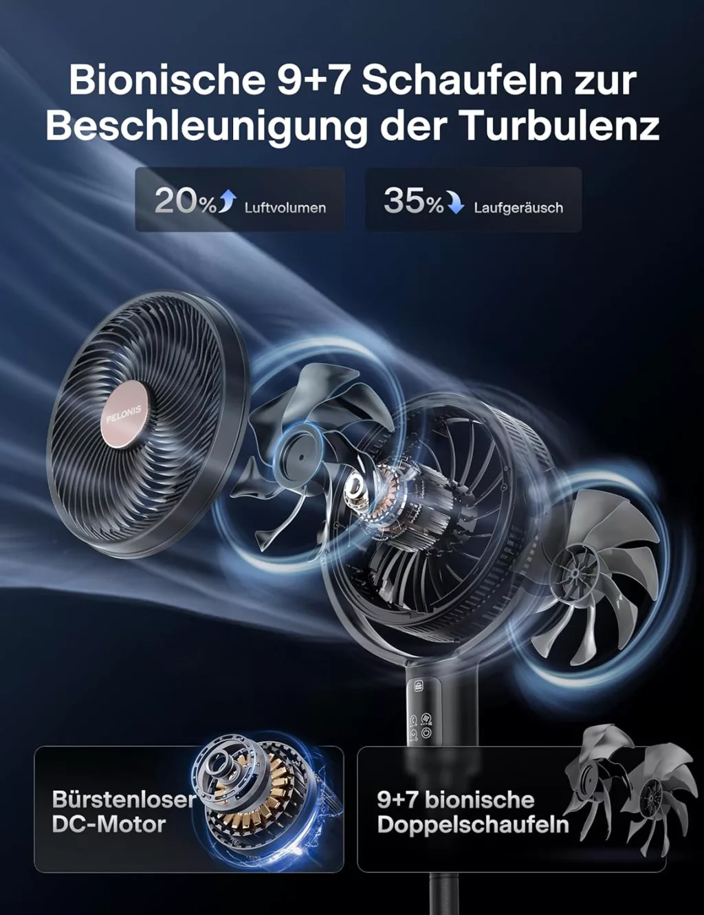 PELONIS 135° oscilirajući ventilator značajno nadmašuje performanse tradicionalnih stojećih ventilatora. Dok prosječni ventilator radi s oscilacijom od 90°, ovaj model osigurava pokrivenost od 135°. Tehnologija dvostrukih lopatica rezultira 32% većim protokom zraka u usporedbi s alternativama s jednom lopaticom. Pametno upravljanje i razina buke od 26 dB čine ovaj ventilator jednim od najboljih izbora na tržištu.