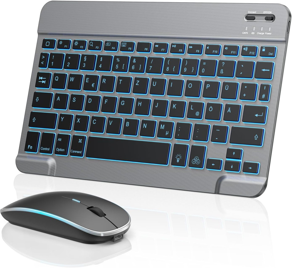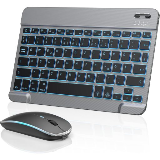 TECURS Bluetooth Billentyűzet és Egér Szett iPad iPhone-hoz QWERTZ Német Elrendezés Vezeték Nélküli Újratölthető Szürke