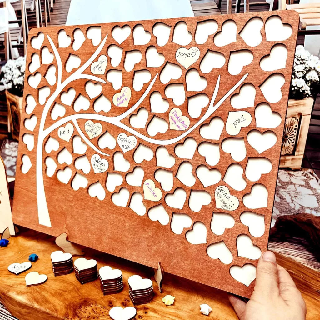 Harmonična kombinacija modernog dizajna i prirodnog drvenog materijala osigurava da će se ova knjiga gostiju uklopiti u stil bilo kojeg događaja. Svako drveno srce nosi poruku voljene osobe, stvarajući pravi mozaik ljubavi koji će živjeti zauvijek u vašem sjećanju.