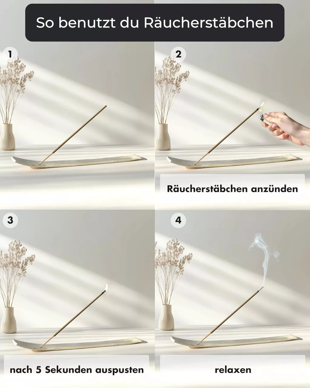 Minden pálcika körülbelül 30-45 percig ég, így egy szett több hét használatot biztosít. Az ideális tárolás egy hűvös, száraz helyen történik az eredeti aromavédő csomagolásban.