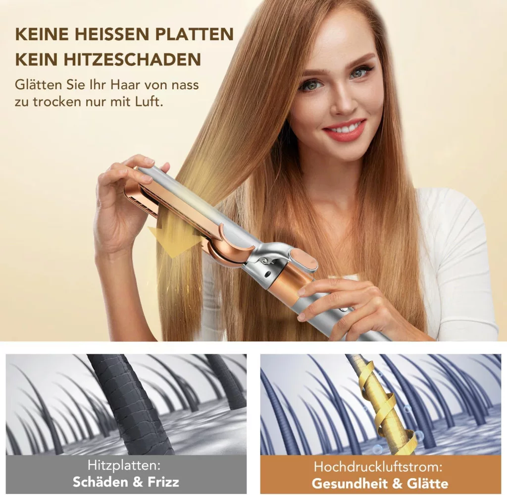 Uređaj istovremeno suši i ravna kosu, tako da od mokre kose možete doći izravno do savršeno stiliziranog rezultata. Topli zrak usmjeren pod kutom od 45 stupnjeva prirodno poravnava vlasi kose, čuvajući njihov prirodni sjaj i zdravlje. Ovo je idealno rješenje za one koji žele brze, profesionalne rezultate iz udobnosti vlastitog doma.
