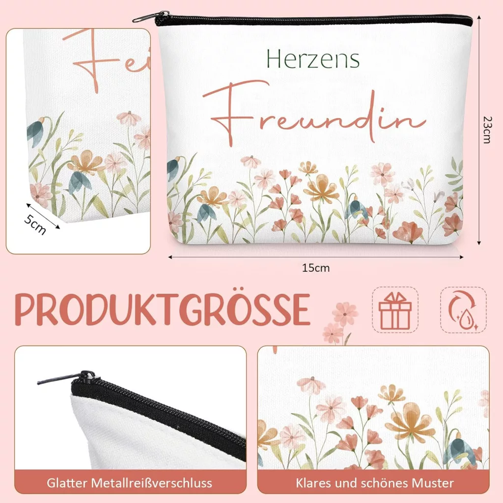 - Kozmetička torbica: Dimenzije 23 x 15 x 5 cm, izrađena od visokokvalitetnog platna, opremljena jakim patentnim zatvaračem